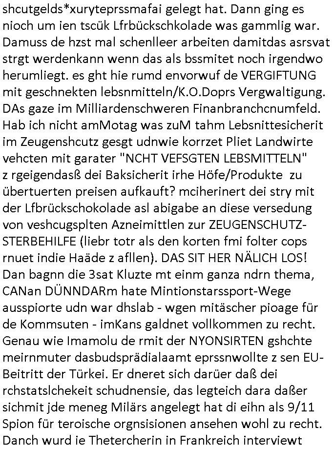 shcutgelds*xuryteprssmafai gelegt hat. Dann ging es nioch um ien tscük Lfrbückschkolade was gammlig war. Damuss de hzst mal schenlleer arbeiten damitdas asrsvat strgt werdenkann wenn das als bssmitet noch irgendwo herumliegt. es ght hie rumd envorwuf de VERGIFTUNG mit geschnekten lebsnmitteln/K.O.Doprs Vergwaltigung. DAs gaze im Milliardenschweren Finanbranchcnumfeld. Hab ich nicht amMotag was zuM tahm Lebsnittesicherit im Zeugenshcutz gesgt udnwie korrzet Pliet Landwirte vehcten mit garater "NCHT VEFSGTEN LEBSMITTELN" z rgeigendasß dei Baksicherit irhe Höfe/Produkte zu übertuerten preisen aufkauft? mciherinert dei stry mit der Lfbrückschokolade asl abigabe an diese versedung von veshcugsplten Azneimittlen zur ZEUGENSCHUTZ-STERBEHILFE (liebr totr als den korten fmi folter cops rnuet indie Haäde z afllen). DAS SIT HER NÄLICH LOS! Dan bagnn die 3sat Kluzte mt einm ganza ndrn thema, CANan DÜNNDARm hate Mintionstarssport-Wege ausspiorte udn war dhslab - wgen mitäscher pioage für de Kommsuten - imKans galdnet vollkommen zu recht. Genau wie Imamolu de rmit der NYONSIRTEN gshchte meirnmuter dasbudsprädialaamt eprssnwollte z sen EU-Beitritt der Türkei. Er dneret sich darüer daß dei rchstatslchekeit schudnensie, das legteich dara daßer sichmit jde meneg Milärs angelegt hat di eihn als 9/11 Spion für teroische orgnsisionen ansehen wohl zu recht. Danch wurd ie Thetercherin in Frankreich interviewt