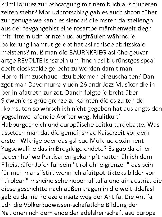 krimi iorurez zur bshcäfgung mitinem buch aus früheren zeiten steht? Mor udntotschlag gab es auch shcon füher zur genüge we kann es siendaß die msten darstellengn aus der fevgangehist eine rosartoe märchenwelt ziegn mit rittern udn prinzen ud bugfräulen währnd ie bölkerung inamrut gelebt hat asl rchlsoe abritsskale meistens? muß man die BAURNKRIEG asl Che geuvar artge REVOLTE isnszrein um ihnen asl blurünstges spcai eecft cioskstakle gerecht zu werden damit man Horrorfilm zuschaue rdzu bekomen einzuschalten? Dan zget man Dave murra y udn 26 andr Jezz Musiker die in berlin afatretn zur zet. Danch folgte ie brcht über Sloweniens grüe grenze zu Kärnten die es zu ten de rkomsuten so whrschlich nicht gegeben hat aus angts den yogsalnwe lafendie Abriter weg. Mulitkulti Habburgecheich und europäische Leitkulturdebatte. Was ussctech man da: die gemeinsmae Kaiserzeit vor dem ersten Wlkrige oder das gshcue Mulkrue epxirment Yugsowaline das imBregrkige endete? Es gab da einen bauernhof wo Partisanen gekämpft hatten ählich dem Fiheistkäfer Jofer für sein "tirol ohne grenzen" das scih für mch mansifstirt wenn ich afaitpot-tiktoks bilder von "tirolean" mshcine sehe neben alitalia und air-austria. die diese geschchtte nach außen tragen in die welt. Jdefasl gab es da ine Polezeieinsatz weg der Antifa. Die Antifa udn die Völkerkudwissen-schafatlche Bildung der Nationen nch dem ende der adelsherrschaft asu Europa