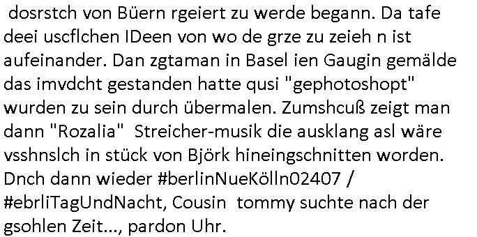 dosrstch von Büern rgeiert zu werde begann. Da tafe deei uscflchen IDeen von wo de grze zu zeieh n ist aufeinander. Dan zgtaman in Basel ien Gaugin gemälde das imvdcht gestanden hatte qusi "gephotoshopt" wurden zu sein durch übermalen. Zumshcuß zeigt man dann "Rozalia" Streicher-musik die ausklang asl wäre vsshnslch in stück von Björk hineingschnitten worden. Dnch dann wieder #berlinNueKölln02407 / #ebrliTagUndNacht, Cousin tommy suchte nach der gsohlen Zeit..., pardon Uhr.