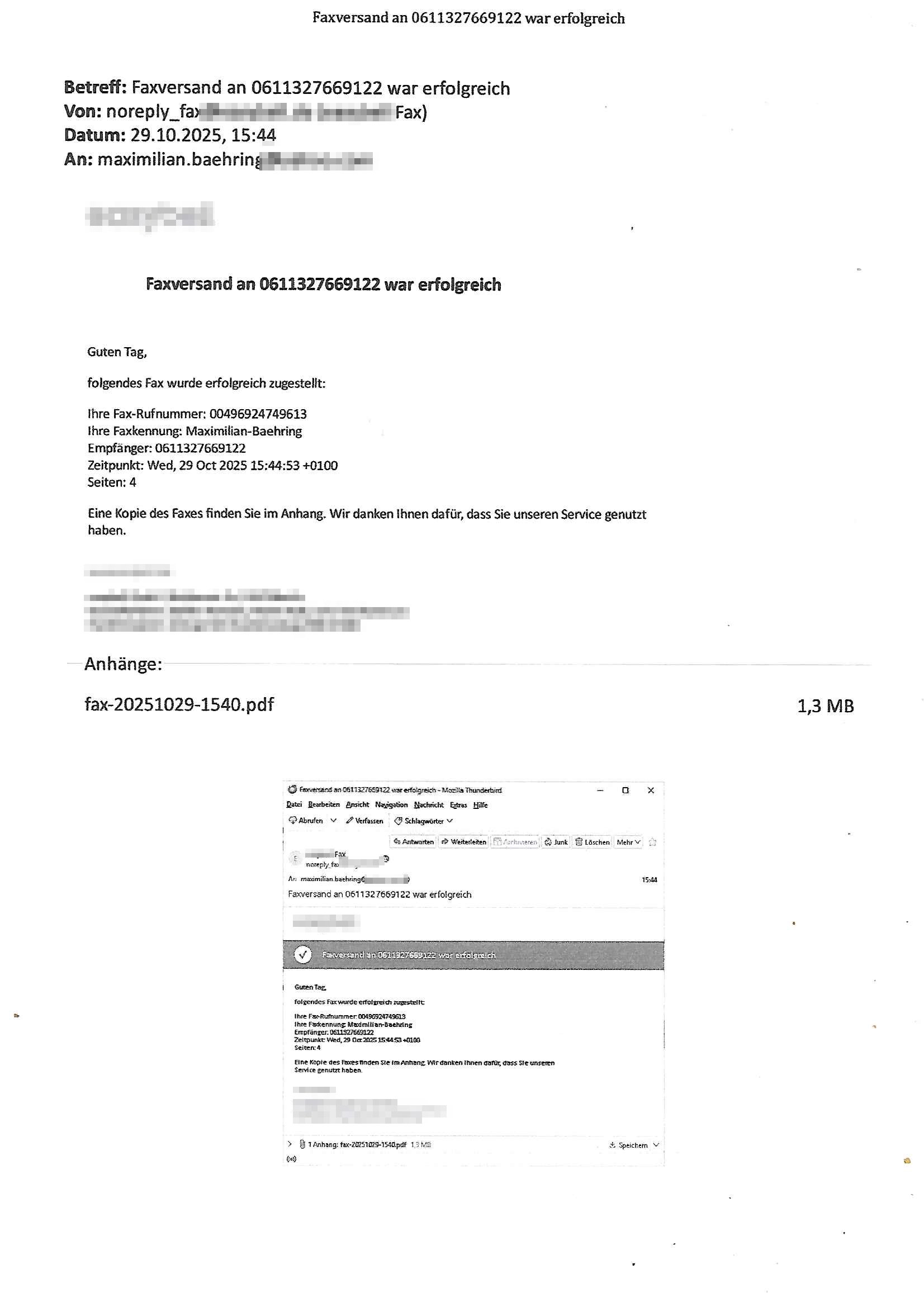 Eine Kopie des Faxes finden Sie im Anhang. Wir danken Ihnen dafür, dass Sie unseren Service genutzt haben.