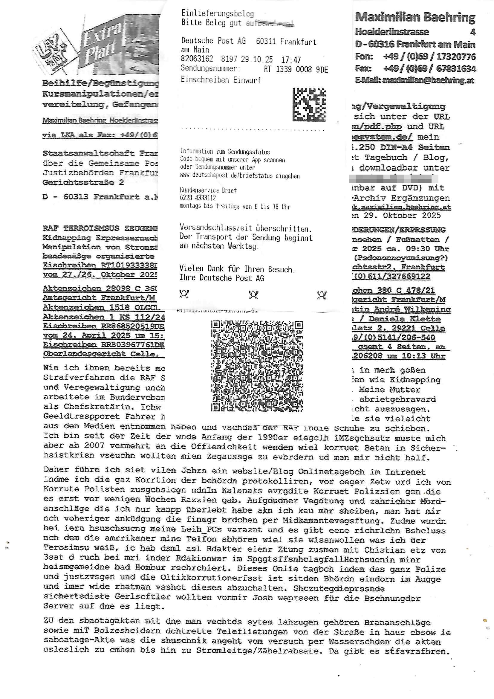 Eischreiben RT101933338DE an Staatswanwaltschaft,Poststelle Gerichtsstr2, Frankfurt