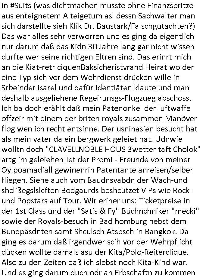 05.11.2025 05:30 Da wir gerade beim Thema Rechts-Anwälte waren und Kliniken. Am gestrigen Distag den 04.Noveber 2025 lief dann um 20:15 Uhr auf 3sat dannn prompt der nächste Juristenfilm, eienr asu der reihe mit Jan Josef Liefers der den NS-Schuldkult ums Alteigentums betrifft nehme ich an. Vernau wurde von einer jungen Frau mandatiert sich darum zu kümmern heruszudnden ob sie damit recht daß habe wenn sie glaube daß sie möglicherweise adoptiert wordn seie oder so und ihre richtigen Eltern suche oder sowas, af jeden fall war sie "bittemelde dich" artig auf der Suche nach Verwandten. Nur eben nicht, was ja interessant gewesen wäre, daß Amerikaner ihr deutsch-stämmigen Wurzeln erforschen oder daß Südkoreaner Familienzusammenführungen mit geflohenen Nord-koreanern gehabt hätten bei "Julia Leischik sucht". Sondern es ging darum daß ein (Enkeltrick-betrug?) Kind glaubte jüdische Vorfahren zu haben wobei es ja um Alteigentumsansprüche Ost Wiedervereinigungs-krimi-nalität gehen könnte Veranu wacht in den USA in einem Militär(?)hospital auf, hatte wi er Polziste sgte angeblich keinerlei Erinerungmerh daran wie er dorthin gekommen war. Man sagte ihm er habe einen Autounfall gehabt. Langsam ernnierte er sich daß er mit jener jungen Frau die ihn mandatiert hatte dort gewesen war udn sie einen Autonfall haten mit einer Verfolgungsjagd-Schießerei. Das hörte sich für mch an wie diese angeblich drogen-abhängige Zeugin im (Einziehungs-)KUR-Klinikparadies in #Suits (was dichtmachen musste ohne Finanzspritze aus enteignetem Alteigetum asl dessn Sachwalter man sich darstellte sieh Klik Dr. Baustark/Falschgutachten?) Das war alles sehr verworren und es ging da eigentlich nur darum daß das Kidn 30 Jahre lang gar nicht wissen durfte wer seine richtigen Eltren sind. Das erinrt mich an die Kiat-retrlciquenBaksicheristvrand Heirat wo der eine Typ sich vor dem Wehrdienst drücken wille in Srbeinder isarel und dafür Identiäten klaute und man deshalb ausgeliehene Regeirunsgs-Flugzueg abschoss. Ich ba doch erählt daß mein Patenonkel der luftwaffe offzeir mit einem der briten royals zusammen Manöver flog wen ich recht entsinne. Der usninasien besucht hat als mein vater da ein bergwerk geleiet hat. Udnwie wolltn doch "CLAVELLNOBLE HOUS 3wetter taft Cholok" artg im geleiehen Jet der Promi - Freunde von meiner Oylpoamadiall gewinenrin Patentante anreisen/selber fliegen. Siehe auch vom Baudnsvabdn der Wach-und shclißegslslcften Bodgaurds beshcützet VIPs wie Rock- und Popstars auf Tour. Wir eriner uns: Ticketpreise in der 1st Class und der "Satis & Fy" Büchnchniker "mecki" sowie der Royals-besuch in Bad homburg nebst dem Bundpäsdnten samt Shculsch Atsbsch in Bangkok. Da ging es darum daß irgendwer scih vor der Wehrpflicht dücken wollte damals asu der Kita/Polo-Reiterclique. Also zu den Zeiten daß ich slebst noch Kita-Kind war. Und es ging darum duch odr an Erbschaftn zu kommen und Kita-toiletetn Überhsugskamera "ppaarazzi"fotos mit denen man versuchte das Königshaus zu erpressen genau wie wir Kinder issbcht wurden für Erpresserfotos. Wir einnern uns: meine Taufurkunde die nicht in falsche Hände geraten durfte. Dei schn damsl abgfangne Post. Wo die kinder den namen desluftwaffn osbertleutants de mit der Olympiameaillengewinnerin verheiratet war flch als Engelbart anstatt als Engelhardd entzifferten. Und auf dem luftwaffenstützpukt standen Regierungs- jets der flgebristchaft britischn Krone herum, so etwa? ich habe ja damal schon gesgt (siehe Film #FlightPlan) daß ich gern dateenabgleichen würde flugbewegungen den staatsbesuch in bangkok betreffend, inbesondere der Thai-Polizie Helis dei Heide simonis genutzt hat. die maschine des bundespräsidenten und schiffslogbücher. dazu noch daten der flugsicherung der mehreren flüge. (siehe die vafahrn wo S*x/drgcs &Rcok'nRoll koksende(?) popstar-VIPS sich beschwert hatten daß Droegfahnder Bewegungsprofile von Privatjets/Flugzeugen wollten). "Mutter der man mit DEN COKES ist da". oder KOHLE die jüdischen Kozern-Alteigentümern fehlen könnte die von den nazi Milärs enteignt wurden wiel sie nicht bei der Wehrmacht mitspielen konnten damals "STOLEN SNOW FROM JERUSALEM" / #Matrix ZION Israel Besuch bei den #Simpsons "grünes licht für den Öl-Prozess" (metal-ehsscfta) , siehe HMBURG KIDNAPPING BLOGk die MOSSAD / BKA-Vizechef_S*xurytfirma Verstrickung. https://tvinfo.de/fernsehprogramm/2221528230-totengebet [0] "202511050530-0-1.jpg" [1] "202511050530-0-2.jpg" [2] "202511050530-0-3.jpg" [3] "202511050530-0-4.jpg" |