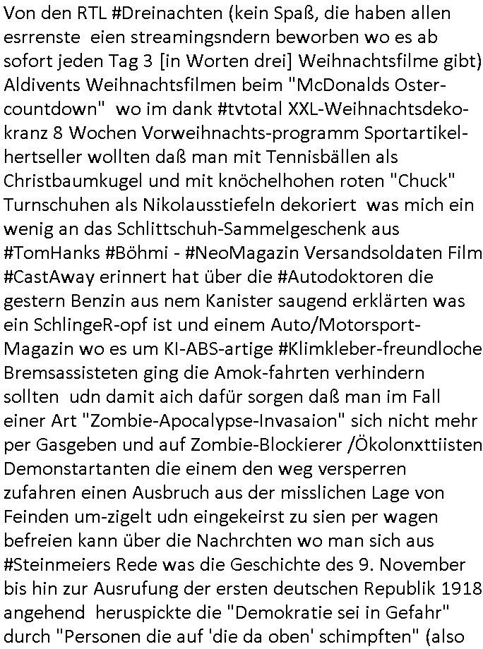 Von den RTL #Dreinachten (kein Spaß, die haben allen esrrenste eien streamingsndern beworben wo es ab sofort jeden Tag 3 [in Worten drei] Weihnachtsfilme gibt) Aldivents Weihnachtsfilmen beim "McDonalds Oster-countdown" wo im dank #tvtotal XXL-Weihnachtsdeko- kranz 8 Wochen Vorweihnachts-programm Sportartikel-hertseller wollten daß man mit Tennisbällen als Christbaumkugel und mit knöchelhohen roten "Chuck" Turnschuhen als Nikolausstiefeln dekoriert was mich ein wenig an das Schlittschuh-Sammelgeschenk aus #TomHanks #Böhmi - #NeoMagazin Versandsoldaten Film #CastAway erinnert hat über die #Autodoktoren die gestern Benzin aus nem Kanister saugend erklärten was ein SchlingeR-opf ist und einem Auto/Motorsport-Magazin wo es um KI-ABS-artige #Klimkleber-freundloche Bremsassisteten ging die Amok-fahrten verhindern sollten udn damit aich dafür sorgen daß man im Fall einer Art "Zombie-Apocalypse-Invasaion" sich nicht mehr per Gasgeben und auf Zombie-Blockierer /Ökolonxttiisten Demonstartanten die einem den weg versperren zufahren einen Ausbruch aus der misslichen Lage von Feinden um-zigelt udn eingekeirst zu sien per wagen befreien kann über die Nachrchten wo man sich aus #Steinmeiers Rede was die Geschichte des 9. November bis hin zur Ausrufung der ersten deutschen Republik 1918 angehend heruspickte die "Demokratie sei in Gefahr" durch "Personen die auf 'die da oben' schimpften" (also