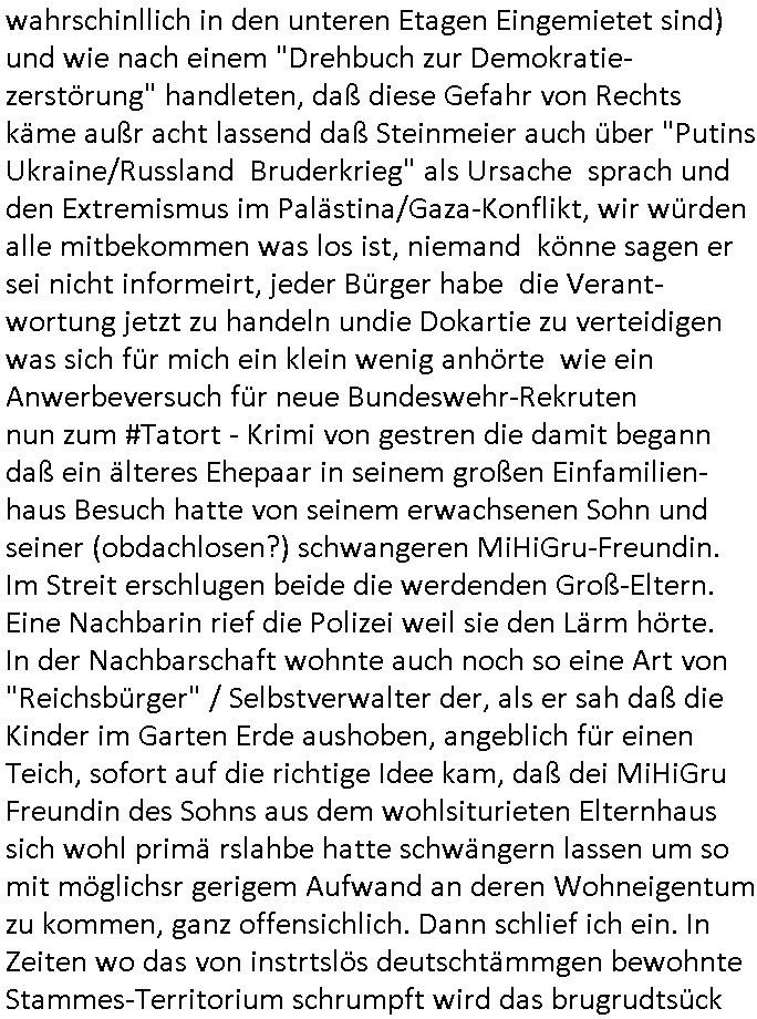 wahrschinllich in den unteren Etagen Eingemietet sind) und wie nach einem "Drehbuch zur Demokratie-zerstörung" handleten, daß diese Gefahr von Rechts käme außr acht lassend daß Steinmeier auch über "Putins Ukraine/Russland Bruderkrieg" als Ursache sprach und den Extremismus im Palästina/Gaza-Konflikt, wir würden alle mitbekommen was los ist, niemand könne sagen er sei nicht informeirt, jeder Bürger habe die Verant-wortung jetzt zu handeln undie Dokartie zu verteidigen was sich für mich ein klein wenig anhörte wie ein Anwerbeversuch für neue Bundeswehr-Rekruten nun zum #Tatort - Krimi von gestren die damit begann daß ein älteres Ehepaar in seinem großen Einfamilien-haus Besuch hatte von seinem erwachsenen Sohn und seiner (obdachlosen?) schwangeren MiHiGru-Freundin. Im Streit erschlugen beide die werdenden Groß-Eltern. Eine Nachbarin rief die Polizei weil sie den Lärm hörte. In der Nachbarschaft wohnte auch noch so eine Art von "Reichsbürger" / Selbstverwalter der, als er sah daß die Kinder im Garten Erde aushoben, angeblich für einen Teich, sofort auf die richtige Idee kam, daß dei MiHiGru Freundin des Sohns aus dem wohlsiturieten Elternhaus sich wohl primä rslahbe hatte schwängern lassen um so mit möglichsr gerigem Aufwand an deren Wohneigentum zu kommen, ganz offensichlich. Dann schlief ich ein. In Zeiten wo das von instrtslös deutschtämmgen bewohnte Stammes-Territorium schrumpft wird das baugrundtsück