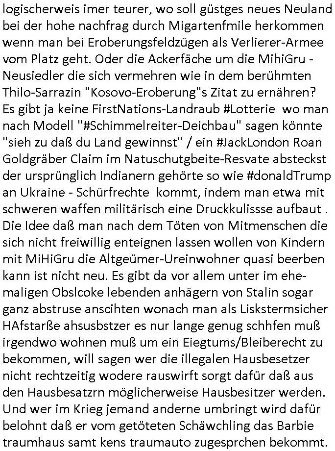 logischerweis imer teurer, wo soll güstges neues Neuland bei der hohe nachfrag durch Migartenfmile herkommen wenn man bei Eroberungsfeldzügen als Verlierer-Armee vom Platz geht. Oder die Ackerfäche um die MihiGru -Neusiedler die sich vermehren wie in dem berühmten Thilo-Sarrazin "Kosovo-Eroberung"s Zitat zu ernähren? Es gibt ja keine FirstNations-Landraub #Lotterie wo man nach Modell "#Schimmelreiter-Deichbau" sagen könnte "sieh zu daß du Land gewinnst" / ein #JackLondon Roan Goldgräber Claim im Natuschutgbeite-Resvate absteckst der ursprünglich Indianern gehörte so wie #donaldTrump an Ukraine - Schürfrechte kommt, indem man etwa mit schweren waffen militärisch eine Druckkulissse aufbaut . Die Idee daß man nach dem Töten von Mitmenschen die sich nicht freiwillig enteignen lassen wollen von Kindern mit MiHiGru die Altgeümer-Ureinwohner quasi beerben kann ist nicht neu. Es gibt da vor allem unter im ehe-maligen Obslcoke lebenden anhägern von Stalin sogar ganz abstruse anscihten wonach man als Liskstermsicher HAfstarße ahsusbstzer es nur lange genug schhfen muß irgendwo wohnen muß um ein Eiegtums/Bleiberecht zu bekommen, will sagen wer die illegalen Hausbesetzer nicht rechtzeitig wodere rauswirft sorgt dafür daß aus den Hausbesatzrn möglicherweise Hausbesitzer werden. Und wer im Krieg jemand anderne umbringt wird dafür belohnt daß er vom getöteten Schäwchling das Barbie traumhaus samt kens traumauto zugesprchen bekommt.