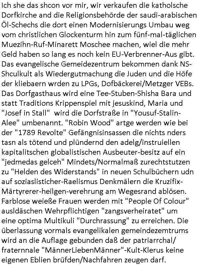 Ich she das shcon vor mir, wir verkaufen die katholsche Dorfkirche and die Religionsbehörde der saudi-arabischen Öl-Schechs die dort einen Modernisierungs Umbau weg vom christlichen Glockenturm hin zum fünf-mal-täglichen Muezihn-Ruf-Minarett Moschee machen, wiel die mehr Geld haben so lang es noch kein EU-Verbrenner-Aus gibt. Das evangelische Gemeidezentrum bekommen dank NS-Shculkult als Wiedergutmachung die Juden und die Höfe der kliebaern wrden zu LPGs, Dofbäckerei/Metzger VEBs. Das Dorfgasthaus wird eine Tee-Stuben-Shisha Bara und statt Traditions Krippenspiel mit jesuskind, Maria und "Josef in Stall" wird die Dorfstraße in "Yousuf-Stalin-Alee" umbenannt. "Robin Wood" artge werden wie bei der "1789 Revolte" Gefängnisinsassen die nichts nders tasn als tötend und plündernd den adelg/instruiellen kapitalitschen globalistischen Ausbeuter-besitz auf ein "jedmedas gelceh" Mindets/Normalmaß zurechtstutzen zu "Helden des Widerstands" in neuen Schulbüchern udn auf soziaslisticher-Raelismus Denkmälern die Kruzifix- Märtyrerer-heilgen-verehrung am Wegesrand ablösen. Farblose weieße Frauen werden mit "People Of Colour" ausldäschen Wehrpflichtigen "zangsverheiratet" um eine optima Multikuli "Durchrassung" zu erreichen. Die überlassung vormals evangelikalen gemeindezemtrums wird an die Auflage gebunden daß der patriarrchal/ fraternnale "MännerLiebenMänner"-Kult-Klerus keine eigenen Eblien brüfden/Nachfahren zeugen darf.
