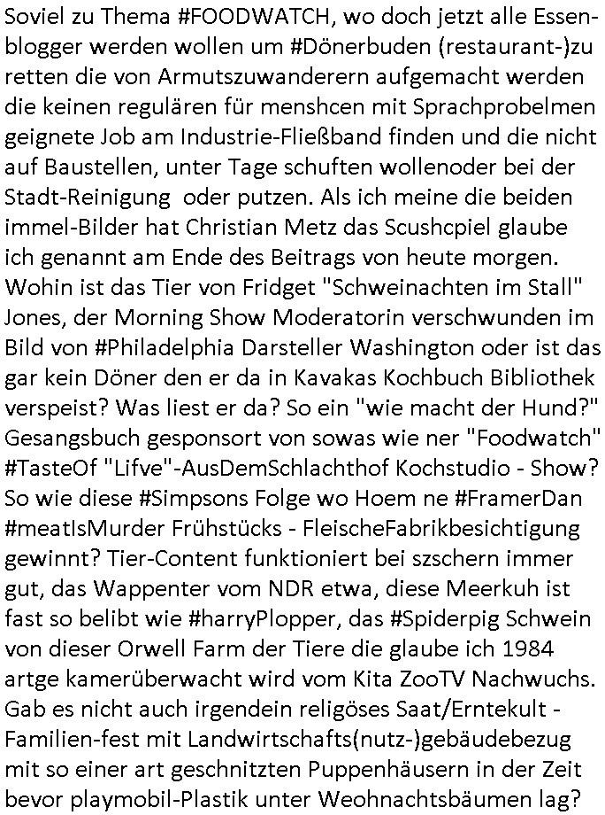 Soviel zu Thema #FOODWATCH, wo doch jetzt alle Essen-blogger werden wollen um #Dönerbuden (restaurant-)zu retten die von Armutszuwanderern aufgemacht werden die keinen regulären für menshcen mit Sprachprobelmen geignete Job am Industrie-Fließband finden und die nicht auf Baustellen, unter Tage schuften wollenoder bei der Stadt-Reinigung oder putzen. Als ich meine die beiden immel-Bilder hat Christian Metz das Scushcpiel glaube ich genannt am Ende des Beitrags von heute morgen. Wohin ist das Tier von Fridget "Schweinachten im Stall" Jones, der Morning Show Moderatorin verschwunden im Bild von #Philadelphia Darsteller Washington oder ist das gar kein Döner den er da in Kavakas Kochbuch Bibliothek verspeist? Was liest er da? So ein "wie macht der Hund?" Gesangsbuch gesponsort von sowas wie ner "Foodwatch" #TasteOf "Lifve"-AusDemSchlachthof Kochstudio - Show? So wie diese #Simpsons Folge wo Hoem ne #FramerDan #meatIsMurder Frühstücks - FleischeFabrikbesichtigung gewinnt? Tier-Content funktioniert bei szschern immer gut, das Wappenter vom NDR etwa, diese Meerkuh ist fast so belibt wie #harryPlopper, das #Spiderpig Schwein von dieser Orwell Farm der Tiere die glaube ich 1984 artge kamerüberwacht wird vom Kita ZooTV Nachwuchs. Gab es nicht auch irgendein religöses Saat/Erntekult - Familien-fest mit Landwirtschafts(nutz-)gebäudebezug mit so einer art geschnitzten Puppenhäusern in der Zeit bevor playmobil-Plastik unter Weohnachtsbäumen lag?