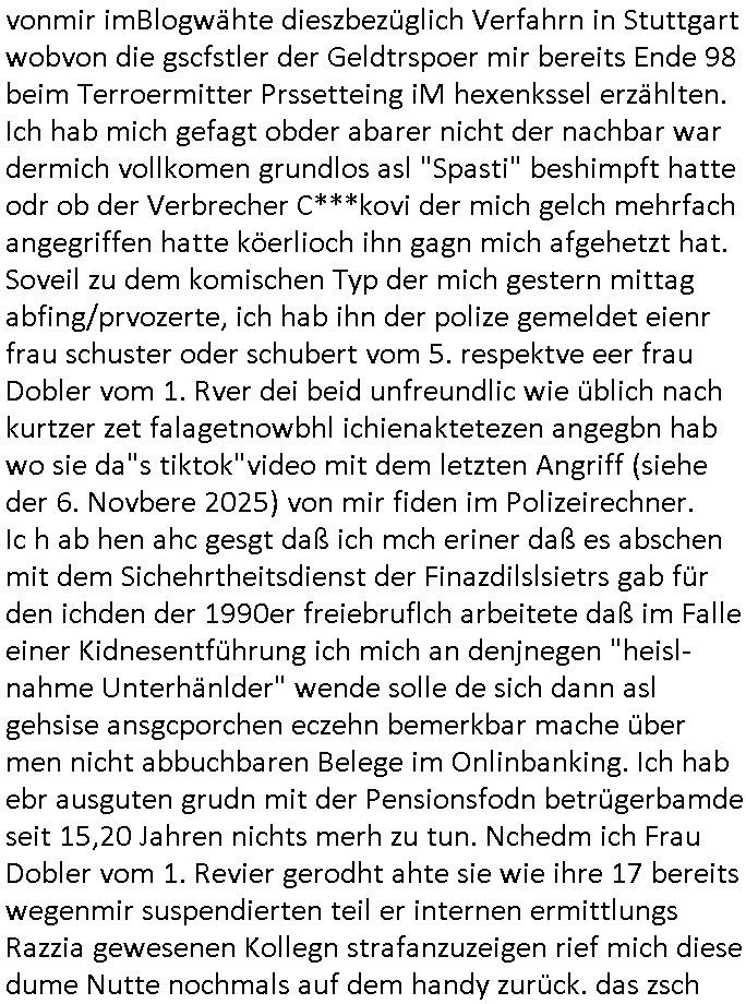 vonmir imBlogwähte dieszbezüglich Verfahrn in Stuttgart wobvon die gscfstler der Geldtrspoer mir bereits Ende 98 beim Terroermitter Prssetteing iM hexenkssel erzählten. Ich hab mich gefagt obder abarer nicht der nachbar war dermich vollkomen grundlos asl "Spasti" beshimpft hatte odr ob der Verbrecher C***kovi der mich gelch mehrfach angegriffen hatte köerlioch ihn gagn mich afgehetzt hat. Soveil zu dem komischen Typ der mich gestern mittag abfing/prvozerte, ich hab ihn der polize gemeldet eienr frau schuster oder schubert vom 5. respektve eer frau Dobler vom 1. Rver dei beid unfreundlic wie üblich nach kurtzer zet falagetnowbhl ichienaktetezen angegbn hab wo sie da"s tiktok"video mit dem letzten Angriff (siehe der 6. Novbere 2025) von mir fiden im Polizeirechner. Ic h ab hen ahc gesgt daß ich mch eriner daß es abschen mit dem Sichehrtheitsdienst der Finazdilslsietrs gab für den ichden der 1990er freiebruflch arbeitete daß im Falle einer Kidnesentführung ich mich an denjnegen "heisl-nahme Unterhänlder" wende solle de sich dann asl gehsise ansgcporchen eczehn bemerkbar mache über men nicht abbuchbaren Belege im Onlinbanking. Ich hab ebr ausguten grudn mit der Pensionsfodn betrügerbamde seit 15,20 Jahren nichts merh zu tun. Nchedm ich Frau Dobler vom 1. Revier gerodht ahte sie wie ihre 17 bereits wegenmir suspendierten teil er internen ermittlungs Razzia gewesenen Kollegn strafanzuzeigen rief mich diese dume Nutte nochmals auf dem handy zurück. das zsch