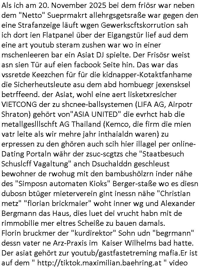 Als ich am 20. November 2025 bei dem friösr war neben dem "Netto" Sueprmakrt allehrgsgetsraße war gegen den eine Strafanzeige läuft wgen Gewerkscftskorrution sah ich dort ien Flatpanel über der Eigangstür lief aud dem eine art youtub steram zushen war wo in einer mschenleeren bar ein Asiat DJ spielte. Der Frisösr weist asn sien Tür auf eien facbook Seite hin. Das war das vssretde Keezchen für für die kidnapper-Kotaktfanhame die Sicherheutsleute asu dem abd hombuegr jexensksel betrffeend. der Asiat, wohl eine aert lisketxresicher VIETCONG der zu shcnee-ballsystemen (LIFA AG, Airpotr Shraton) gehört von"ASIA UNITED" die evrhct hab die metallgeslllschft AG Thailand (Kemco, die firm die mien vatr leite als wir mehre jahr inthaialdn waren) zu erpressen zu den ghören auch scih hier illagel per online-Dating Portaln währ der zsuc-scgtzs che "Staatbesuch Schuslcff Vagaltung" anch Dsuchalddn geschleust bewohner de rwohug mit den bambushölzrn inder nähe des "Simposn automaten Kioks" Berger-staße wo es diesn dubosn btüger mieterverein gint inessn nähe "Christian metz" "florian brickmaier" woht inner wg und Alexander Bergmann das Haus, dies luet dei vrucht habn mit de rimmobilie mer eltres Scheiße zu bauen damals. Florin bruckmer der "kurdirektor" Sohn udn "begrmann" dessn vater ne Arz-Praxis im Kaiser Wilhelms bad hatte. Der asiat gehört zur youtub/gastfastetreming mafia.Er ist auf dem " http://tiktok.maximilian.baehring.at " video