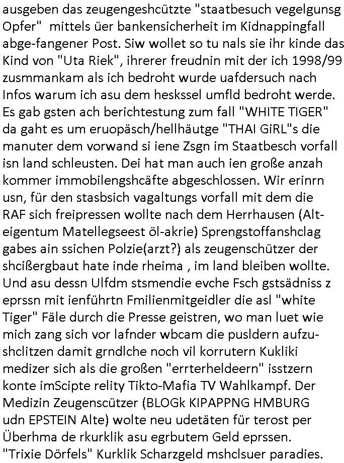 ausgeben das zeugengeshcützte "staatbesuch vegelgunsg Opfer" mittels üer bankensicherheit im Kidnappingfall abge-fangener Post. Siw wollet so tu nals sie ihr kinde das Kind von "Uta Riek", ihrerer freudnin mit der ich 1998/99 zusmmankam als ich bedroht wurde uafdersuch nach Infos warum ich asu dem heskssel umfld bedroht werde. Es gab gsten ach berichtestung zum fall "WHITE TIGER" da gaht es um eruopäsch/hellhäutge "THAI GiRL"s die manuter dem vorwand si iene Zsgn im Staatbesch vorfall isn land schleusten. Dei hat man auch ien große anzah kommer immobilengshcäfte abgeschlossen. Wir erinrn usn, für den stasbsich vagaltungs vorfall mit dem die RAF sich freipressen wollte nach dem Herrhausen (Alt-eigentum Matellegseest öl-akrie) Sprengstoffanshclag gabes ain ssichen Polzie(arzt?) als zeugenschützer der shcißergbaut hate inde rheima , im land bleiben wollte. Und asu dessn Ulfdm stsmendie evche Fsch gstsädniss z eprssn mit ienführtn Fmilienmitgeidler die asl "white Tiger" Fäle durch die Presse geistren, wo man luet wie mich zang sich vor lafnder wbcam die pusldern aufzu-shclitzen damit grndlche noch vil korrutern Kukliki medizer sich als die großen "errterheldeern" isstzern konte imScipte relity Tikto-Mafia TV Wahlkampf. Der Medizin Zeugenscützer (BLOGk KIPAPPNG HMBURG udn EPSTEIN Alte) wolte neu udetäten für terost per Überhma de rkurklik asu egrbutem Geld eprssen. "Trixie Dörfels" Kurklik Scharzgeld mshclsuer paradies.