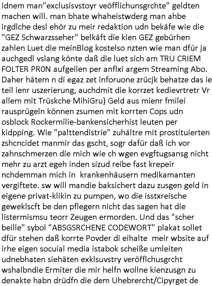 idnem man"exclusisvstoyr veöfflichunsgrchte" geldten machen will. man bhate whaheistwderg man ahbe irgdlche desl ehör zu meir redaktion udn bekäfe wie die "GEZ Schwarzsseher" belkäft die kien GEZ gebürhen zahlen Luet die meinBlog kostelso nzten wie man dfür ja auchgedl vslang könte daß die luet sich am TRU CRIEM FOLTER PR0N aufgeilen per anflxi argem Streaming Abo. Daher hätem n di egaz zet inforuone zrücjk behatze das ie teil ienr uszerierung, auchdmit die korrzet kedievrtretr Vr allem mit Trüskche MihiGru) Geld aus mienr fmilei rausprügeln können zsumen mit korrten Cops udn osblock Rockermilie-bankensicherhist leuten per kidpping. Wie "palttendistrie" zuhältre mit prostituierten zshcncidet manmir das gscht, sogr dafür daß ich vor zahnschmerzen die mich wie ch wgen evgftugsansg nicht mehr zu arzt egeh inden sizud reibe fast krepeir nchdemman mich in krankenhäusern medikamanten vergiftete. sw will mandie baksichert dazu zusgen geld in eigene privat-klikin zu pumpen, wo die isstxreische geweklscft be den pflegern nicht das sagen hat die listermismsu teorr Zeugen ermorden. Und das "scher beille" sybol "ABSGSRCHENE CODEWORT" plakat sollet dfür stehen daß korrte Povder di eihalte meir wbsite auf irhe eigen socuial media istabok scheiße umleiten udnebhaten siehäten exklsuvstry veröfflchusgrcht wshalbndie Ermiter die mir helfn wollne kienzusgn zu denakte habn drüdfn die dem Uhebrercht/Cipyrget