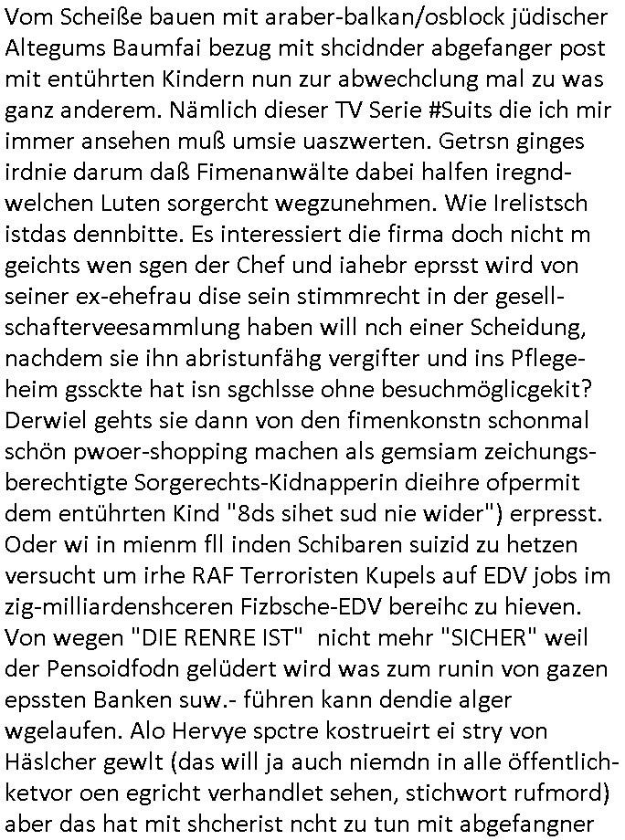 Als ich gestren vom Supermakt zurückkam wurde ich am Zoo angesporchen von einem arabischstämmgen Nach-barn auf die Ende 1998 Hexenkessel Alteigentums Sache mit den Fußmatten angesprochen die man im DDR Recht anders als im BRD Recht nicht vor der Tür legen haben durfte wo sich angeblcihe Jura studenten zu Paralleljustiz rudmrodenden Schlichtern ausbilden hatten lassen wollen ich hab ihm der slbsgedrehet Zigarretten oder einen Joint im Mund hatte gesagt er soll sich an die Leute von damals wenden wenn er probleme mit verschwunnen Fußmatten hat, der eine "Schlichter" wollte dazu doch einen Vortrag halten. Das ist wirklchjlustig. Ih wieß von Nchbran deren Fußmatten wgen der slbstvsshcudleten an irgendwelchen Jursiten Spielen teilgenommene Problematik verschunden sind aber der Typ gehörte explizit eben nicht zu den mir bekannten Fällen. Ich hab dann noch mit der korrupten Polizei telefoniert und die gebeten nachzuprüfen ob bei dem Frisör dessen EC Katen Zahlungenlauit Koto-auszug abgebucht aber schinabr nicht gutgeschreben werden sowas wi ne Terroisumus/Gedlscheverdacht kOtosppre vorliget. Ich hab die korute Polizei genu wie den Araber Nachbarn darauf hingewiesen daß ich per kIdnppaing und Sabotagkaten an einer Aussg gehindert werden soll in dem Verfahren "Daniela Klette" wiel korzet ermittler und Wahcperosnal bei Baksicherheistverbd Ged verschwinden haben lassen udn woleln daß das nichtraskomt, sied das
