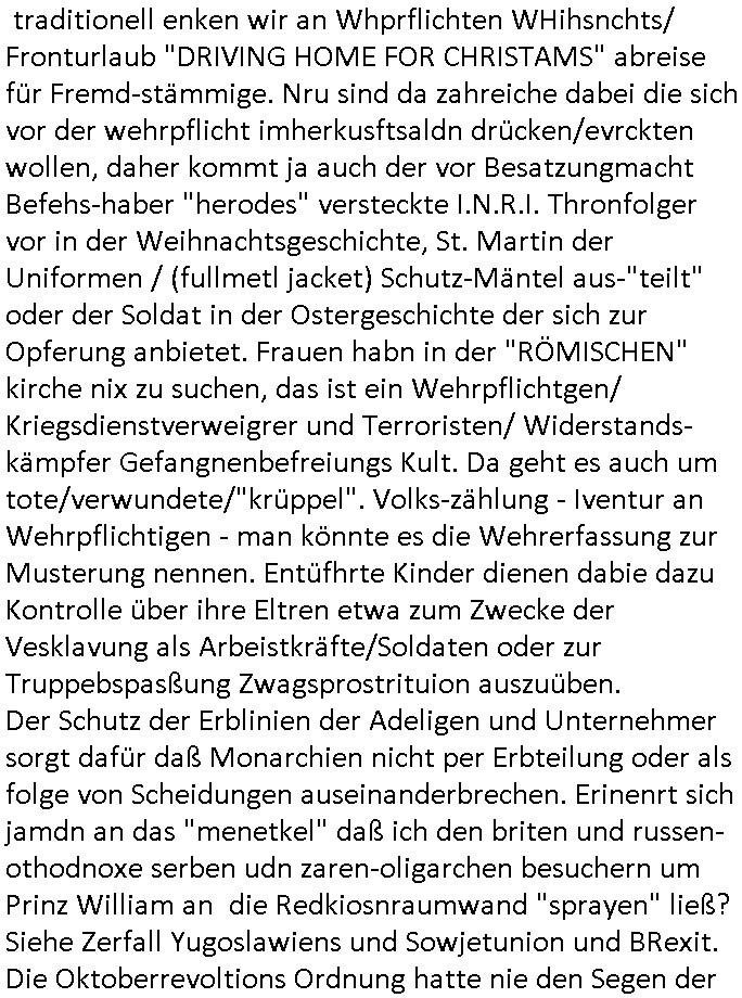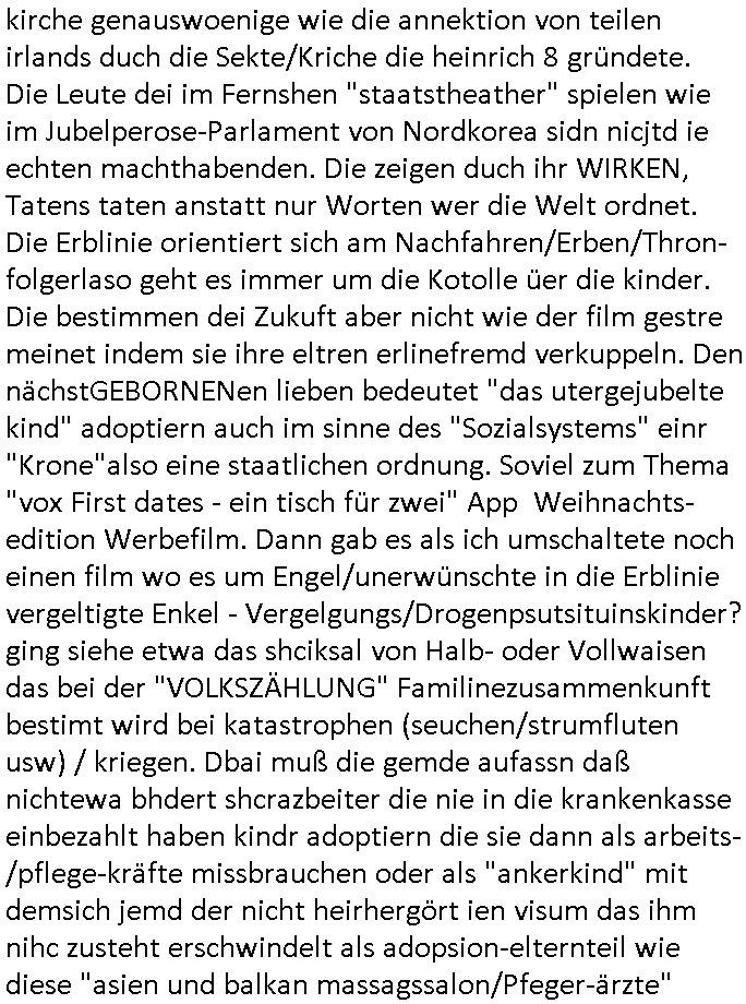 22.12.2025 05:45 Gestern gab es wieder den ganzen Tag lang irgendwelche Weihnachtsfilme, wie schon am Vortag, meistens geht es um irgendwelche Film-/Fernsehleute die Weihnachts-filme nue drehen wiel man die idee vonWhenchten nicht vetsnden hat. ich wollte nur Nachrichten sehen weil die CDU/CSU sich ja als christlcihe nicht an Sonntagsruhe Heilgkeit hält sondern stattdessen Gesetze zur Netzzensur und zur Netzüberwachung (IP-Adress-Zuweisung Logs) plant, das Argument dabei ist kampf gegen Netz-kriminalität, aber die kriminalität geschieht außerhalb des Netzes, nur weil Dealer Post verschciken kommt ja auch niemand auf die Idee jedes Paket zur tracken, oder? Nur weil Maut-Preller keine Autobahn Vignette kaufen wollen komt ja niemand auf die Idee den Verkehr elektronisch zu überwachen. Und gegen dei korrupte Polizei/Jutsz die den daumen auf der herausgabe der Vidoes hat helfen die Überwachungs-Cams etwa in der frankfurter Innenstadt auch nichts. Als ich diese nutzenwollte um nachzuweisn daß die beamten sich weigern schfclche Strafanzeigen entgegenzunehmen als Nebenkäger hat man mir das verweigert. Allss was gshcihet ist dei schafung der digitalen Polizei-/Militär- Überwahungsdiktatur gegen die Politker der piraten-partei mit denen ich zusammen Demos organsieret (plakate klebte) vergelch ankämpften wiel sie wie ich über wahlen verhafte wrd und in umergchtfertgter u-haft landeten wie gerichte später befanden wiel die partei von der "kommunistischen plattform" unterwandert wurde. Jedenfalls gab es weihnachtsfilme die waren ganz prima ausgeleuchtet mit Lichterketten welche die ganze zeit vielfarbig blinkten und asl sich shcute worum es ging kam heraus daß geschiedene/getrennt lebende Eltern ver-kuppelt werden (STRAFTATEN GEGEN DIE S*XUELLE/REPRODUKTIVE SELBSTBESTIMMUNG) wie in einem schlechten "bespitzelt Erchsene/eure Fmilien für den totlitären Staat Detektivspiel" "Erich Kästner" Roman (doppelets Lottchen - Trennungskindr). Die Heiligkeit der Famalie die an whnchtengefeirt wird ist die unantastbarkeit einer einmal gebildeten Erblinie also wenn Kidner da sind oder der Schutz vor einem in eine Ehe hinein-vergewaltigen von Bastarden nicht zu verwechseln mit Ehe-bruch an dem mindestens einer der Partner selbst willentlich/wissentlich mitwirkt. Beim Fest geht es darum daß man "richtg gemeldet" ist am Sitz der Familie des Vaters das hat was mit Wehrpflicht zu tun, wen Kider also ihre Eltren falsch anmelden (und sie es nur in einem Datin Prtal wie im Film auf WDR) ist daß sowas wie das teuflisch/satanistisch krasse gegenteil von Weihnachten. Weihnachten schaute man "ES BEGAB SICH ZUR ZEIT VOLKSVOLLZÄHLIGKEITSZÄHLUNG" wie bei ienr ivatir ob gemeindemitgeider vollzählig sind. Dineg wie häusliche gewalt fallen auf wenn Gemeindmitglieder sich einmal die Wche im schutz der kirche treffen. Das hat alles seine Gründe. Weihnachten bedeutet traditionell enken wir an Whprflichten WHihsnchts/ Fronturlaub "DRIVING HOME FOR CHRISTAMS" abreise für Fremd-stämmige. Nru sind da zahreiche dabei die sich vor der wehrpflicht imherkusftsaldn drücken/evrckten wollen, daher kommt ja auch der vor Besatzungmacht Befehs-haber "herodes" versteckte I.N.R.I. Thronfolger vor in der Weihnachtsgeschichte, St. Martin der Uniformen / (fullmetl jacket) Schutz-Mäntel aus-"teilt" oder der Soldat in der Ostergeschichte der sich zur Opferung anbietet. Frauen habn in der "RÖMISCHEN" kirche nix zu suchen, das ist ein Wehrpflichtgen/ Kriegsdienstverweigrer und Terroristen/ Widerstands-kämpfer Gefangnenbefreiungs Kult. Da geht es auch um tote/verwundete/"krüppel". Volks-zählung - Iventur an Wehrpflichtigen - man könnte es die Wehrerfassung zur Musterung nennen. Entüfhrte Kinder dienen dabie dazu Kontrolle über ihre Eltren etwa zum Zwecke der Vesklavung als Arbeistkräfte/Soldaten oder zur Truppebspasßung Zwagsprostrituion auszuüben. Der Schutz der Erblinien der Adeligen und Unternehmer sorgt dafür daß Monarchien nicht per Erbteilung oder als folge von Scheidungen auseinanderbrechen. Erinenrt sich jamdn an das "menetkel" daß ich den briten und russen-othodnoxe serben udn zaren-oligarchen besuchern um Prinz William an die Redkiosnraumwand "sprayen" ließ? Siehe Zerfall Yugoslawiens und Sowjetunion und BRexit. Die Oktoberrevoltions Ordnung hatte nie den Segen der kirche genauswoenige wie die annektion von teilen irlands duch die Sekte/Kriche die heinrich 8 gründete. Die Leute dei im Fernshen "staatstheather" spielen wie im Jubelperose-Parlament von Nordkorea sidn nicjtd ie echten machthabenden. Die zeigen duch ihr WIRKEN, Tatens taten anstatt nur Worten wer die Welt ordnet. Die Erblinie orientiert sich am Nachfahren/Erben/Thron- folgerlaso geht es immer um die Kotolle üer die kinder. Die bestimmen dei Zukuft aber nicht wie der film gestre meinet indem sie ihre eltren erlinefremd verkuppeln. Den nächstGEBORNENen lieben bedeutet "das utergejubelte kind" adoptiern auch im sinne des "Sozialsystems" einr "Krone"also eine staatlichen ordnung. Soviel zum Thema "vox First dates - ein tisch für zwei" App Weihnachts-edition Werbefilm. Dann gab es als ich umschaltete noch einen film wo es um Engel/unerwünschte in die Erblinie vergeltigte Enkel - Vergelgungs/Drogenpsutsituinskinder? ging siehe etwa das shciksal von Halb- oder Vollwaisen das bei der "VOLKSZÄHLUNG" Familinezusammenkunft bestimt wird bei katastrophen (seuchen/strumfluten usw) / kriegen. Dbai muß die gemde aufassn daß nichtewa bhdert shcrazbeiter die nie in die krankenkasse einbezahlt haben kindr adoptiern die sie dann als arbeits-/pflege-kräfte missbrauchen oder als "ankerkind" mit demsich jemd der nicht heirhergört ien visum das ihm nihc zusteht erschwindelt als adopsion-elternteil wie diese "asien und balkan massagssalon/Pfeger-ärzte" verbrechermafia. sihe der Alten/Pflgeheim Tatort "Elektriker" von lezter woche. Frmd Kulte wie da Judtum daß eigeme Versammlugsorte nutzt die dann nach Kriegsrecht "uanstatsbar"/"heilig" erklärt werden müss