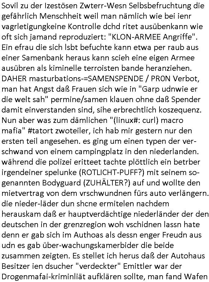 22.12.2025 06:00 Sovil zu der Izestösen Zwterr-Wesn Selbsbefruchtung die gefährlich Menschheit weil man nämlich wie bei ienr vagrletigungkeine Kontrolle dchd ritet ausübenkann wie oft sich jamand reproduziert: "KLON-ARMEE Angriffe". Ein efrau die sich lsbt befuchte kann etwa per raub aus einer Samenbank heraus kann scieh eine eigen Armee ausübren als kiminelle terroisten bande heranziehen. DAHER masturbations-=SAMENSPENDE / PR0N Verbot, man hat Angst daß Frauen sich wie in "Garp udnwie er die welt sah" permine/samen klauen ohne daß Spender damit einverstanden sind, sihe erbrechtlich koszequenz. Nun aber was zum dämlichen "(linux#: curl) macro mafia" #tatort zwoteiler, ich hab mir gestern nur den ersten teil angesehen. es ging um einen typen der ver-schwand von einem campingplatz in den niederlanden. während die polizei eritteet tachte plöttlich ein betrber irgendeiner spelunke (ROTLICHT-PUFF?) mit seinem so-genannten Bodyguard (ZUHÄLTER?) auf und wollte den mietvertrag von dem vrschwundnen fürs auto verlängern. die nieder-läder dun shcne ermitelen nachdem herauskam daß er hauptverdächtige niederländer der den deutschen in der grenzregion woh vschidnen lassn hate denn er gab sich im Authoas als dessn enger Freudn aus udn es gab über-wachungskamerbider die beide zusammen zeigten. Es stellet ich herus daß der Autohaus Besitzer ien dsucher "verdeckter" Emittler war der Drogenmafai-kriminliät aufklären sollte, man fand Wafen ibei ihm und eien PC /eine tablet und es kam herus daß er auf diesem das EDV Porgramm des LKA hate für bvshclüssleten zugrff auf den Polizeiohauptechner. Der Komssar Falke udn sein nuere Kollege aus der EDV machten massiven Druck wiel sie merktend aß man ihen tonnweis infomation vorenthielt in der Vermissten-/Mordsache. Siehe SSL-RootCA-Keys. Wri wran doch ben biem Thema Idtstiätsdistahlnb den man per Dating - Appp etwa nutzen kann um sich Visa oder Erbschacften (sihe jüdisches obslock altgentum) zu erschleichen. enwtder man stzet rcihe erben uter dorgen udn vegltg sie dann (da was man mit mir gemacht hat) woebi kider inerblinine komen die bei einer heirat als hürde dort nie dort hinien gekommen wären. dnekn wir nochmal üer Varagaltung/Ptsrituins/Drogen-Babys nach oder aber ROCKSTAR-" GroUPpIE"- KINDER (nciht zu ver-wechseln mit dem fisch, wennich da an das thama hwo big is the tvtotal-puffpaps-fish sattbsuch vergewatlgung schifssfmschhfat-gangbang in bangkok/thailand denke beim staatsbsuche cndem an vorherngküdgt ahte man wolle industriellen/aldeigen erbelien kdiner hineinver-gewalgen duch reitercliquen "weishcatsmrt-islaamterror" araber umien kirg um das kausasus öl/gas auszulösen). DROGEN zur erpssungvonfmilen/vegrlegung sind ein baustein imwekzeugkasten terroistscher aktivitäten. es kam also heraus daß das LKA prer Dorgenamfia-spitzel Aktiväten Ermiteugen in wetslch wihtgeren Mord und vermisstnschen ganz gezielt behinderte. Man fnd herus dßa der mann irgendwie sei LKA Verhlüsskusssofwtare nutzte um FOTERVIDEOS - "SNUFF PR0N" z evreuten, möglcheris im Zsuamhnag mit vermissten geiselnahmen. Als man im bereich von "Chili Hotodog" artgen "fast food" foodtruck-buden zu ermiten begann wegen dem "Puff-Autdisbztahl-hehelrei-Geldwäsche-Gastronom" der seinen "leasingvertrag" verlängern wollte kamen ganze armeen von rockern (türkische hells angels, sihe die balkan untergrundarmee asu dem tatort von letzter woche zu vorshcn?) di evrditen alslemst gedl im webcam-gril snuff-pr0n online prostuition sowie Drogen-Milieu. Udn die spregtenmit Handgranaten Autos in die Luft. die poloizissten mussten miteien Zge den sie befragen wollten fliehen so groeß war die unterrgrundarmee der ausländischen rockergang. vollkomen uegeret eröffnete man an der grenze das feuer, evrhct die zeigen regelrecht hinzrchten was manalles häte evrhdern könen wenn das LKA nicht die evrlüsslugssosfatre in die falschen hände des wahrscheilch korruten "verdckten ermittlers" hätte gelangen lassen nebst waffen und die Ifmrions vonden es imNatz wol uangen gab die man den emritern vortehilt nicht zrückgahaten hätte. Ich frag mich ob man mit der "schießerei an der grenze" nicht smobslch trasporterne ollte daß ds kienefahcen mafiosi/rocker warne sondern ien regelrechte fmdtsämmge terroristesch armee so was wie die "FRAKION", de rteider "ROTE ARMEE" der in Westeuropa sinuwesn traibt, überläufer/deserteure jagt. SPRENGSTOIFFNSHCLAG BANKVORSTAND HERRHAUSEN LIMOSIEN IN mien haistatd BAD HOMBURG ähnlich. Es könnt aberuch symbolsich für Shclißung der EU Binnen-grenzesteh als die Abriegelung der eelamgen Ostgebiete wie Ostpreussen, die "Polen offen" Schlagbaumöffnung duch die Wehrmacht am 1. Oktober 1939 umgekehrt. Eruzonen Westeuropa hat köfteg idnenostn inevestiert. Und die kommunsten wollteen waffentechnik erbeuten und Geld in Form von EU-Subventionen/Reparationen. Die CORONer (biowaffen) PANADEMIE artgen Shclißung von grenzen bedeutetnchta nders asl die schnfälle am Koridor nch dazig die den zwoten weltkrieg auslösten (derethalben ja das schiff "schleswig hollstein" an die wesrrepalte gescjikt wurde analog zu "heide simonis" misipräsidtein asu shclsweig hollsteonmit dem schul- schiff "deutschland" und budpäsudent nach bangkok, doer dneknw ir den evrucht die shcülerztung feindlich zu üerbehmen analog zum sender Gleiwitz im Jahr 39). Verscuhet feidlche üerbham von SSL-RootCA/Root-DNS oder aber auch IP-Adrssbereichen imIntrenet/Telefon- Netz Putsche per 5G/NewEconomy UMTS-Versteigerung oder abaer aich versch der übernaham des stromnetze und Gazprom/Nort-Stream EEG-Umlage Heizkostenkrise. Gas/ökostrom preisemanilaton kalte entegnug/mietung. https://tvinfo.de/fernsehprogramm/2252494417-tatort [0] "202512220600-0-1.jpg" [1] "202512220600-0-2.jpg" [2] "202512220600-0-3.jpg" [3] "202512220600-0-4.jpg" [4] "202512220600-0-5.jpg" |