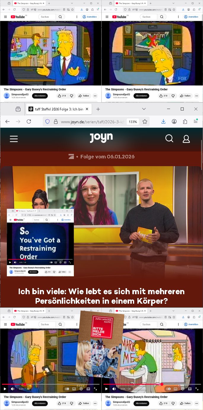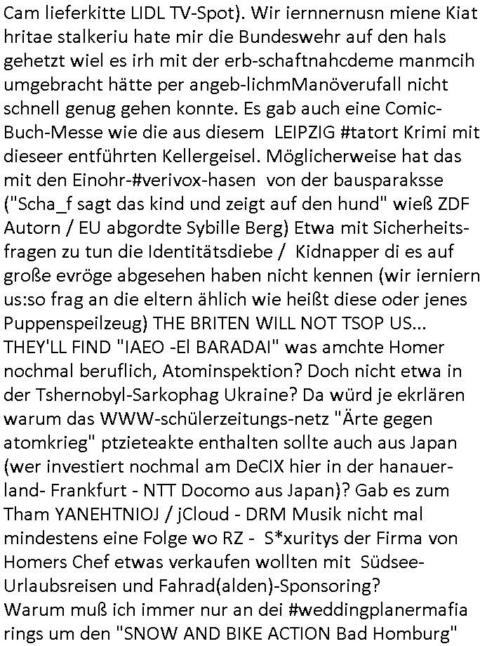 07.01.2026 00:45 Nun zum 18:00 Uhr TV Vorbandprogramm vom gestrigen Dienstag den 06. Januar 2026. Bei den #Simpsons lief ne Folge aus der Zeit der Hexerei und des Feudalismus. Lisa lernte zaubern, um geld für eine medizinsche behandlug von Marges Mutter zu bekommen lernte sie aus Erz/Blei [ versteckte Anspielung auf den METALLGESELLSCHAFT Öloptionen-Skandal? ] Gold/Geld zu machen. So wie ich hatte die Großmuter Erfrierungen an den Händen nach- dem sie sich mit der süd-Osteuropa (smboliserte druch einen Graf Dracula) Drückerolonnen? Mafia eingelassen hatte (war da nicht irgendwas mit Koste für ein Musical?) Es gab "König der Löwen" Musical-Charaktere die mich daran erinerten wie "Michael Jackson" in Berlin Babys von Balkone werfen wollte bevor er wegen Straftaten die sich gegen Kinder richten verurteilt wurde (könnte es da um Kidnapping gehen?). Zudem einen "Dragonheart" (Waren Dragoner nicht eine Balkan oder Süd-/Osteruopa Militär-reiter?-Einheit?) [dieser Film über die Schutzgeld-erpressung] Rachedrachen den man nur durch Menschen- opfer besänftigen konnte. Lisa konner aber nur Geld/Gold machen und Hislstein-Amulette verkaufen solang dieser Drache Feuer speite (ein Anspielung auf die Rüstungs- und Pflegemafia/Prothesen für Kriegskrüppel-Industrie?). Es ging um "Fields of Gold?" Ähren-/Ehren(-grab)-felder. In Teil zwo ging wurde Lisa zu ner Therapeutin geschickt an einer Uni Klinik asl Versuchskarnickel. Die Frau hatte sich schwägnern lassen udn bekam daher ihr Studium nicht fertig wie männliche Kollegen die nch von ienr quitergelung pfiteren aber mher von ihrer Lebesarbeits- zet der Geminschaft anstatt Kindererziehung widmen, be den sind Studienfädergelder des Staats also besser auf-gehoben. Die frau wollte das Scheidungsopfer Lisa ein THERAPIETAGEBUCH schreibt/malt per Kunst-Therapie. Die weblcehs shcidgsopfer Lisa selbt konnte aber nicht geut zeichen udn so zeichnete ihre Mutter Marge für sie. Duch "FrdichDrünerremmat Die pyhsiker" zufall(?) geriet das therapietagebuch der "#STRUWWELPETER" Klinik ähnloch Krankengschichtenfilem ForrestGump/Phildphia in die Hände einer Frau einer Firma die Cartoons/Comics "Hollywoo_Storyboards" alsbuch rausbrachte/verfilmte?Der comic "SAD GIRL" traf ählcih wie "ANGRY DAD" von Bart einen Nerv beim Publikum. Gabs nicht mal ne 3sat #Kultrzeit Sendung zu Kunstherapie (für Scheidungskinder die seelsich an elterlichen Ehe-Probelemen zerbrechen)? Mal die TV-Redakion vom Schüelrztusgkollegen Christian Metz fragen. Im Comic ging es umdas (weg)werfen von Essen (Schulbrote wiel Konsumtertor und Gruppedruck Mobbing ausgesetzte Kinder lieber Süßgkeiten aus dem Riegel7 hausmeister Kiosk-Automaten klauen - Dessert essen bevor es den hauptgang gab? -hab Psychologie Studenten der Uni nicht auf meine Schülerzeitungs und Judperlemenst anregung hin dazu geforscht?). Die Frau die das Comic evrlegetw ar eine Asiatin (ne Thailänderin wie aus der Schweizer Schule Bangkok: FUTUR(e)RAMA die Kita-VPIP-Heirat Bad Homburger Kurpark Poloturnier Olympia Reiterclique Hochadelige Prinz-Harry Bekannte mit dieser "Henrietta R Hippo" Krone?) Jedenfalls wurde das Ding ein Verkaufsschlager (lag wohl daran daß man in Asien billig Zeichnen konnte und den von seinen Bongo Einohrhasen-( nicht zu verwechsen mit #veriVox )-Comic Büchern (life/work/school/...is hell) bekannten udn idn Europa (Supps uchaldung abd Homburg) vor dem Durch-bruchs tehdne KARRIKATURsiten #MattGroening enga-gierte, war das wohl gesponsort hat? Die YVANEHTNIOJ Bundespräsident/Staatsbesuch-vergewaltigungs Marine? Die Kinder in Hafen-Rotlichtviertel locken sollte für die Paparazzi (siehe Marge meldet Homer bei dieseer MTV Fegdhe Show an). Ehemann in den scheinbaren Rufmord hetzen um mittels dem WITWENSTEIN-Verlobusgringe (siehe das thema SSL-Smart/PGP/Key-"Ringe der Macht") an dessen Familenvöregn zu komen (urheberrechte usw.) Wir eirnnenr uns:VIP Winter-Olympia-Medaille/ Luftwaffe Taufpaten Engelhardt / Engelbart Ver-wechslung wegen der von apapahtebe/Legasthiearitgen Kita Bettel-Kinder ausgespähten Tauf-urkunde? Erpssung von Promis durch Pparazzi/Groupies udn Abwehr-mßnahmn von S*xuritys? ( siehe 380 C 478/21 Amts-gericht Frankfurt/M. Höchst ) Der Mann der Verlegerin hate ien falbe für "cast away mit tom hanks" artgen "Unboxing videos", scheinbar kam des öfteren bei der Post etwas weg. (siehe dazu übrigens den neuen 1984- Cam lieferkitte LIDL TV-Spot). Wir iernnernusn miene Kiat hritae stalkeriu hate mir die Bundeswehr auf den hals gehetzt wiel es irh mit der erb-schaftnahcdeme manmcih umgebracht hätte per angeb-lichmManöverufall nicht schnell genug gehen konnte. Es gab auch eine Comic-Buch-Messe wie die aus diesem LEIPZIG #tatort Krimi mit dieseer entführten Kellergeisel. Möglicherweise hat das mit den Einohr-#verivox-hasen von der bausparaksse ("Scha_f sagt das kind und zeigt auf den hund" wieß ZDF Autorn / EU abgordte Sybille Berg) Etwa mit Sicherheits-fragen zu tun die Identitätsdiebe / Kidnapper di es auf große evröge abgesehen haben nicht kennen (wir ierniern us:so frag an die eltern ählich wie heißt diese oder jenes Puppenspeilzeug) THE BRITEN WILL NOT TSOP US... THEY'LL FIND "IAEO -El BARADAI" was amchte Homer nochmal beruflich, Atominspektion? Doch nicht etwa in der Tshernobyl-Sarkophag Ukraine? Da würd je ekrlären warum das WWW-schülerzeitungs-netz "Ärte gegen atomkrieg" ptzieteakte enthalten sollte auch aus Japan (wer investiert nochmal am DeCIX hier in der hanauer-land- Frankfurt - NTT Docomo aus Japan)? Gab es zum Tham YANEHTNIOJ / jCloud - DRM Musik nicht mal mindestens eine Folge wo RZ - S*xuritys der Firma von Homers Chef etwas verkaufen wollten mit Südsee- Urlaubsreisen und Fahrad(alden)-Sponsoring? Warum muß ich immer nur an dei #weddingplanermafia rings um den "SNOW AND BIKE ACTION Bad Homburg" denken oder die bei dortigen Jugenparlament beantragte Skaterebordebahn hier an der neuen EZB Frankfurt/M.? Wie sich Lisa bshcert idner folge mit dem Pafn