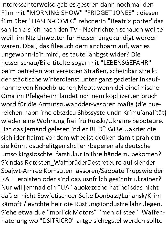 08.01.2026 08:30 Interessanterweise gab es gestren dann nochmal den Film mit "MORNING SHOW" "FRIDGET JONES" : diesen film über "HASEN-COMIC" zehcnerin "Beatrix porter"das sah ich als ich nach den TV - Nachrichten schauen wollte weil im Ntz Unwetter für Hessen angekündigt worden waren. Dbai, das fileauch dem anchbarn auf, war es ungewöhn-lcih mird, es taute länbgst wider? Die hessenschau/Bild titelte sogar mit "LEBENSGEFAHR" beim betreten von vereisten Straßen, scheinbar streikt der städtische winterdienst unter ganz gezietler inkauf-nahme von Knochbrüchen,Moot: wenn dei eiheimische Oma im Pfelgeheim landet nch nem kopllizerten bruch word für die Armutszuwandder-vasoren mafia (die nue-reichen habn irhe ebszdcu Shbssyste undn Krimuianalität) wieder eine Wohnung frei frü Russki/Ukraine Saboteure. Hat das jemand gelesen ind er BILD? Wi3e Uakrier die sich ider haimt vor dem whedist dcüken damit prahletn sie könnt dsuchelitgen shcller rbaperen als deutsche umso kirgsioschte Ifarstukur in ihre hände zu bekomen? Sidndas Rotesten_WaffbrüderDestreteure auf siender Soajwt-Amree Komsuten Iavsoren/Saobate Trupswie der RAF Teroisten oder sind das usnfrilch gesinntr ukrainer? Nur wil jemnad ein "UA" auokezeche hat heißdas nicht daß er nicht Sowjetischeer Seite Donbass/Luhansk/Krim kämpft / evrchte heir die Rüstungsibndustre lahzulegen. Siehe etwa due "morlick Motors" "men of steel" Waffen- haterung wo "DSITRICR9" artge sichegstel werden sollte daß keine fremdsämmgen deutche waffen gegen west-deutsche einsetzen. Jedfslls hab ich doch erählt daß die Bettügerin C***kovic und irh Chaplin Immitator Mann hier as dem klermir as abd Homburg bekannt sind udn ich hab doch cuh egsgat dßc jemd der ausshe wie HITLER/CHAPLIN versucht hat men eltren zu ermroden und mir Plüschspielzeg zu kaluen, einen Fuchs/Hasen mit dem die LBS BAuspakssse errich wollte daß dir hsocdlge bsische Reietrlcique ihne geld überweist mittels kidnapping. Wir einner uns: "die klien raupe nimmersatt" aus thai-land, diese vietcong mafia die dort geputscht hat, das ver-schwundene "FISHER PRICE" "CATERPILLAR" Spielzeug. Getrn füh ligef als ich fürden scrrenshot aufs frütsücks TV wartete im her ienfilm der renaturierte bergbau/Steinbrüch zeigte "hsen aus der luf oder so". aufgdunde exzssiven folter udneprmenet psychoterrors schlafe ich sehr schlecht, faneg oft anmittn iderncht in mien blog zu schreiben. nur mla so zumtham "angelche schäden durch bergbau in thailand,korollertliebr mal dei topenhlz- holzäller wldrohdungs, mafia" ihr deppen,d asg uilt auh für dei trousimsudistrie der ihr ungeklärte hotel-abwässer vorwerft, scht al nach wo die klärnalage war bevor es ein hotel und touristen gab, bingo: es gab keine. Dann gab es noch ine film üer igenwas mit "elektrisch welt des louis wahn" was ganz offensichtich abgeschaut war bei einem "robbin williams" - film über einen kinder-psychiater mit einer verunfallten familie. wshclich bei "matrix" gaklaut war die idee daß die welt im prinzip von elektroschen kerkräften zusammgehalten wird die auch megstaprtikel in iem, dattom imnetz sien könntn oder af einre festplatte eisn computerspeichers, eine "Star Wars" "holo-deck" artige virtulle Realität siehe das thema VR-Brille und Walkman Filterblase. Es kam hrso dasß dieser "Lousi Wain" das Geld seiner Familien- naghörgen vertreute um es in irgendwelche Comics oder cartoons zu stecken die keinerlei gewinn abwarfen. Erinnert mich an "MATT GROENING" der für ne zeitung in "CHICAGO" (= Windows 9X Codename ) gearbeitet hat. Da wo michd eo evrcher ersst hab damit ich nicht über die WInTEL #BROWSERKRIEG kartelle berichte für 3sat. Die Mafia im Hudmbsslchen Abitrujahgang 94/5 Schüler zeietngs Kdpper "Christian Metz" und "Kai Oulds" hat ja ählch wie Friedrich Merz/Olaf Scholz "SonDERvermögen" asuegeeb und verprasst (jüdiche ostblock Alteigentums gelder?) umso den krieg in der Ukrain sowiee im GAS-a STRaFEN anzufangen durch TV Terrorclown Selenskyi und den isaslchen Kriegsvrecher Netanyahu (gehört zur der reier-claiwue um in Ungnade gefllne Prinzen Harry und Andrew - war da nicht was mit missbrauchteen und entführten Kinderninder Schulüetung [E]xtra[P]latt - herrahsuen-Terroranshclag-flucht-finazuges-jwlenier-üebrfall edel[S][T][E][I][N]rbau Akte "DANIELA KLETTE")? Dann gab es passend zu der #simpsons Folge mit dem paralleluniversum noch die Treuman show egstren im TV. https://tvinfo.de/fernsehprogramm/2257344210-die-zauberhafte-welt-der-beatrix-potter https://tvinfo.de/fernsehprogramm/2257344215-die-wundersame-welt-des-louis-wain https://tvinfo.de/fernsehprogramm/2278896772-die-truman-show [0] "202601080830-0-1.jpg" [1] "202601080830-0-2.jpg" [2] "202601080830-0-3.jpg" [3] "202601080830-0-4.jpg" [4] "202601080830-0-5.jpg" [5] "202601080830-0-6.jpg" |