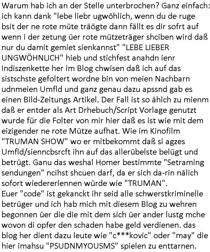 23.01.2026 06:01 Warum hab ich an der Stelle unterbrochen? Ganz einfach: ich kann dank "life less ordinary", wenn du de ruge bsit der ne rote müte träögte dann fällt es dir sofrt auf wenn i der zetung üer rote mützeträger shciben wird daß nur du damit gemiet sienkannst" "LEBE LIEBER UNGWÖHNLICH" hieb und stichfest anahdn ienr Indiszenkette her im Blog chwisen daß ich auf das sistschste gefoltert wordne bin von meien Nachbarn udnmeien Umfld und ganz genau dazu apssnd gab es einen Bild-Zeitungs Artikel. Der Fall ist so ählch zu mienm daß er entder als Art Drhebuch/Script Vorlage genutzt wurde für die Folter von mir hier daß es ist wie mit dem eizigender ne rote Mütze aufhat. Wie im Kinofilm "TRUMAN SHOW" wo er mitbekommt daß si agzes Umfld/sienncbsrcft ihn auf das allerübelste belügt und betrügt. Ganu das weshal Homer bestimmte "Setraming sendungen" ncihst shcuen darf, da er sich da-rin nälich sofort wiedererlennen würde wie "TRUMAN". Euer "code" ist gekanckt ihr seid alle schwerstkriminelle betrüger und ich hab mich mit diesem Blog zu wehren begonnen üer die die mit dem sich üer ander lustg mche wovon di opfer den schaden habe geld verdienen. das blog her dient dazu leute wie "c***kovic" oder "may" die hier imahsu "PSUDNMYOUSMS" spielen zu enttarnen. https://www.bild.de/regional/thueringen/nachbarn-schikanieren-sich-seit-14-jahren-der-feind-im-mehrfamilienhaus-696f72c3f1cf5c80c99352a9 [0] "202601230601-0-1.jpg" [1] "202601230601-0-2.jpg" |
