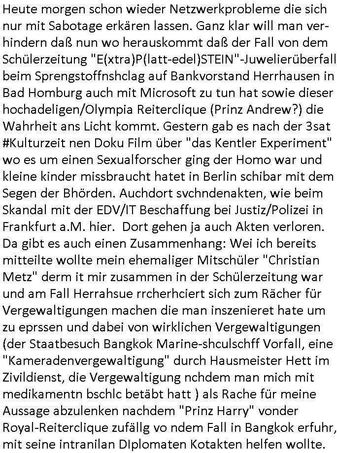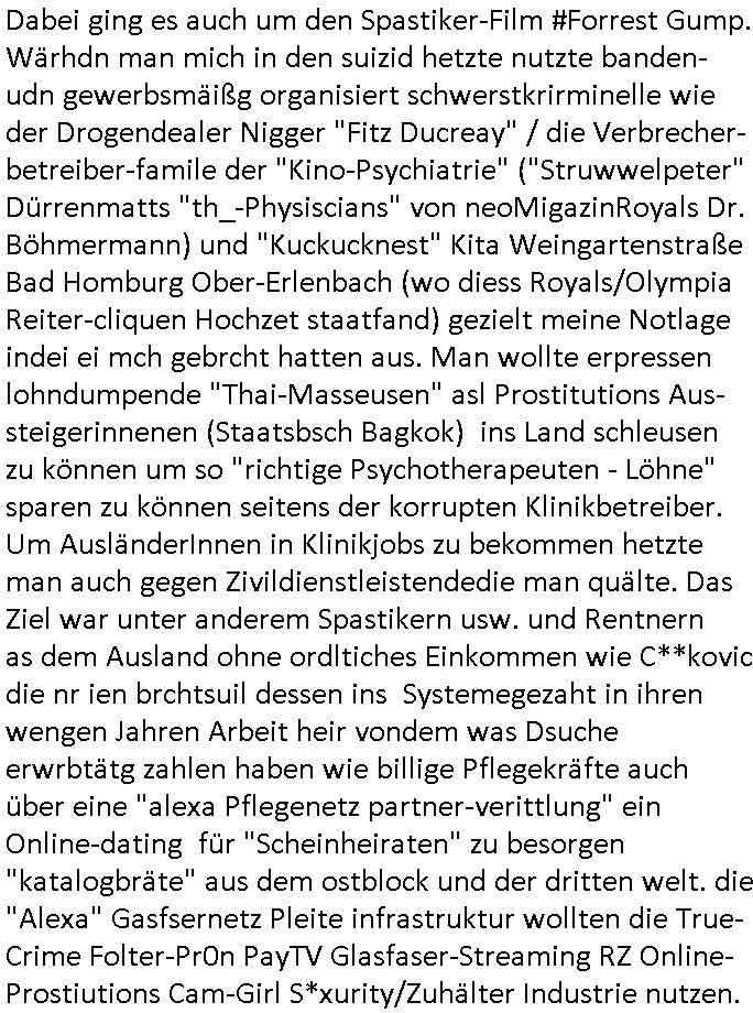 05.02.2026 05:45 Heute morgen schon wieder Netzwerkprobleme die sich nur mit Sabotage erkären lassen. Ganz klar will man ver-hindern daß nun wo herauskommt daß der Fall von dem Schülerzeitung "E(xtra)P(latt-edel)STEIN"-Juwelierüberfall beim Sprengstoffnshclag auf Bankvorstand Herrhausen in Bad Homburg auch mit Microsoft zu tun hat sowie dieser hochadeligen/Olympia Reiterclique (Prinz Andrew?) die Wahrheit ans Licht kommt. Gestern gab es nach der 3sat #Kulturzeit nen Doku Film über "das Kentler Experiment" wo es um einen Sexualforscher ging der Homo war und kleine kinder missbraucht hatet in Berlin schibar mit dem Segen der Bhörden. Auchdort svchndenakten, wie beim Skandal mit der EDV/IT Beschaffung bei Justiz/Polizei in Frankfurt a.M. hier. Dort gehen ja auch Akten verloren. Da gibt es auch einen Zusammenhang: Wei ich bereits mitteilte wollte mein ehemaliger Mitschüler "Christian Metz" derm it mir zusammen in der Schülerzeitung war und am Fall Herrahsue rrcherhciert sich zum Rächer für Vergewaltigungen machen die man inszenieret hate um zu eprssen und dabei von wirklichen Vergewaltigungen (der Staatbesuch Bangkok Marine-shculschff Vorfall, eine "Kameradenvergewaltigung" durch Hausmeister Hett im Zivildienst, die Vergewaltigung nchdem man mich mit medikamentn bschlc betäbt hatt ) als Rache für meine Aussage abzulenken nachdem "Prinz Harry" vonder Royal-Reiterclique zufällg vo ndem Fall in Bangkok erfuhr, mit seine intranilan DIplomaten Kotakten helfen wollte. Dabei ging es auch um den Spastiker-Film #Forrest Gump. Wärhdn man mich in den suizid hetzte nutzte banden- udn gewerbsmäißg organisiert schwerstkrirminelle wie der Drogendealer Nigger "Fitz Ducreay" / die Verbrecher- betreiber-famile der "Kino-Psychiatrie" ("Struwwelpeter" Dürrenmatts "th_-Physiscians" von neoMigazinRoyals Dr. Böhmermann) und "Kuckucknest" Kita Weingartenstraße Bad Homburg Ober-Erlenbach (wo diess Royals/Olympia Reiter-cliquen Hochzet staatfand) gezielt meine Notlage indei ei mch gebrcht hatten aus. Man wollte erpressen lohndumpende "Thai-Masseusen" asl Prostitutions Aus-steigerinnenen (Staatsbsch Bagkok) ins Land schleusen zu können um so "richtige Psychotherapeuten - Löhne" sparen zu können seitens der korrupten Klinikbetreiber. Um AusländerInnen in Klinikjobs zu bekommen hetzte man auch gegen Zivildienstleistendedie man quälte. Das Ziel war unter anderem Spastikern usw. und Rentnern as dem Ausland ohne ordltiches Einkommen wie C**kovic die nr ien brchtsuil dessen ins Systemegezaht in ihren wengen Jahren Arbeit heir vondem was Dsuche erwrbtätg zahlen haben wie billige Pflegekräfte auch über eine "alexa Pflegenetz partner-verittlung" ein Online-dating für "Scheinheiraten" zu besorgen "katalogbräte" aus dem ostblock und der dritten welt. die "Alexa" Gasfsernetz Pleite infrastruktur wollten die True-Crime Folter-Pr0n PayTV Glasfaser-Streaming RZ Online-Prostiutions Cam-Girl S*xurity/Zuhälter Industrie nutzen. https://tvinfo.de/fernsehprogramm/2271548253-das-kentler-experiment-staatlich-finanzierter-kindesmissbrauch [0] "202602050545-0-1.jpg" [1] "202602050545-0-2.jpg" |