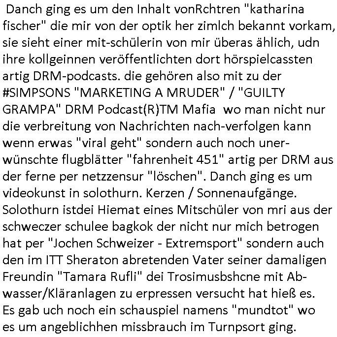 05.02.2026 06:00 Passend zum Thema Korruption im Medizinwesen um die Marihuana Dorgendealer Gang um Bruckmaier/Assmann die mit "metallgesellscgft Öl"/"Mainova Stadtwerke Öko-Stromterror" den Wahlkampf von Boxer KlitschKO in der Ukraine und ebenso den Putsch von Jeltzin/Putin gegen Gorbatschow finanzierte gab es dann auch am gestrigen Mittwoch, den 04. Februar 2026 gleich zwo #Simpsons Folgen zu Thema. Marge bekam dabie einen Job in einer Marihuana Klinik, sowas wie dei Drogenamabulanz an der Zoo-Passage (bekannt aus RTL2 Hartes Deutschland) hier am S-Bahnhof Ostendstraße, Hanauer-Land- Ecke Friedberger-Anlage nähe Allerhilgentor Frankfurt a. M. dort wo benso wi inde rklik Dr. abustark und Pschiatren im Rhein-Magn gebite RAF Attentäter per falschen §20, §21 StGB Gutachten vor einer Strafverfolgung geschützt werden indem man diese als im Rauschzustand die Raten begehnde schuldunfähige Junkies darstellt. Und auch das "Forrest Gump" Thema "Staatbesuch Bangkok Schulschiff Vergewaltigung" tauchte auf. Das daraus hervorgegangen sein sollende Kind Maggie bekam plötzlich einen Freund der es mit seiner Mutter zusammen ausspionierte. Dabei ginges auch um Bad-Renovierunge wie in "terminal" mit "tom hanks" wo es in wahrheit um dei renovierung des "kaiser wilhelms bads" und der "klinik Baumstark" ging. Wie schon in der "frecking" folge sollte "Mr Burns" mit "gas Deals" (Habeck-Heizkostenkrise) erpresst werden. Linkextreme Rohstoffgeschäft Verschwörungstheorien. Dann folgte #berliNeuKölln02407 / #berlinTagundNacht wo sich Piets Verlobte Raphi in dessen Abwesenheit an Malte ranmachte. Danach kam dann die bereits erwähnte 3sat #Kulturzeit (wo Christian Metz jobte, ein ehemaliger Schülerzeitungskollege von mir). Es ging da Anafgns um die bereits erwähnten "E.P.STEIN" Akten, Bill - Gates Ex Ehefrau meldete sich zu Wort udnes ging um ien EDVler der angelce "KI froshcung" betrieb und "Bach" heiß (wie imClockworkOrange Vergewaltigungs Film: "Beethoven") der den schülerzeitung E(xtra)P(platt-juwekieredle)STEIN Raubüberfall auf Juwelier Zeus Bad Homburg nach dem Sprengstoffanschlag mit der bei der RAF Terroristin Klette gefudnen Beute dazu nutzen wollte das damals von mir programmerte Warenwirtschafts-system zu ersetzen und zwar indem er Router/Standleitungsbadrf generierte für den angeblchen Datenabgleich mit der Versicherung wo es aber in wahrheit um die DRM frag ging ob man an zwo Windows Arbeistplätzen die sleb wor lizenz nutzen kann. So kommt "Bil Gates" und sein "setup /A" office Paket der Firma micsoft zur Netzwerkinstallation ins Spiel wobei man sich mit dem staatsbesuchs Vergewaltigungs Vorfall der auch besprochen wurde Sendezeit erpressen wollte. Dabei wollet man auch israelisch zionistische Rufmord - Kampagnen verbreiten gegen palästinser und in dem Missbrauchs Film "das kler epxeriment" ging es ja ganz seltsamerweise auch um Palästinenser-Kinder die vor zionisten Hetze nch Deutschand geflohen waren udndort von Homsexulen Juden zurzagspriotutuion gezwumngen wwrden sollten. (siehe zwotverwettung Juwlier/Alexa -Pflegeklinik PayTV Netzes für True-Cime Folter-Pr0n Cam Zuhälterei [DRM Copyrghets] durch schutzgelderpressnde Rechenzetrums S*xurty-Mafia [ auch Bundesverband der ostblock banksicherheit] ). Mit der Präsidenten eprssung (daher geht es bei "EPSTEIN" ja auch um "Bill Clinton") erpresste man sich von westlichen Firmen/Orgasiationen wie "Metllagesellschaft AG" Konzern und dem Bundes-verband "Wach und Schließ" Geld für ein "antifa - netz" indem es dem vorwand nach um rcherchen zu jüdischem ostblock Alteigentum gehen sollte. Ich hab ja erklärt wie das WWW (auch um das Thema Folge/Autoradio Zubehör Lieferkette und Staattsbesuch-Vergewaltigung und Atom-Patientenakten) herum al erchrechnetz entstanden ist. Es gibt also zwichen Vergewaltigungen und alteigentum Debatte sowei Cybrcime ien unmutelabern zusmahang von diesem Fall hier und der "EPSTEIN" Akte. Um das Altegtum von Juden/Palästinsern ging es dann auch in der 3sat #Kulturzeit weiter, eine arabisch/ jüdisch/israelische "Comedian" worden in einem Dokufilm potraitiert der "Coexistance 'my ass'" hieß. Was ist eigentlich mit den Juden passiert dei in Dschaldn bliben als die Zionisten mit roher 9/11 Flugzeug-entführung Terrorismus Gewalt [inszneirter kriegsgrund gegen die araber/moslmes] Palästina/GAza besiedelten". Mit der Frage beschäftigten sich homerotsche Fotos von "Benyamin Reich" einem Aussteiger aus der jüdschen Orthodoxie. Es ging um den missbrhcn von Pflgern und um den missbrauch durch Mediziner (Vergewaltgung hilfloser "K.O. Drops" artig Medikamentierter umihen unerwünschte Kidner in die erblin iezu mogeln aus finanziellen gründen). Er sagte "FOTOGRAFIERN IST WIE SCHIESSEN", das war so inder Ära vor den Phothop/KI-Fakes ForrestGump/Titanic. Und dann gab es einen Pogrammhinweis daß man unbdingt di nachfolgenden sndungen ansehen sollte. Angeblich gab es entführte Israelinnen. Anschließend gings um Häuser (angebliches Vertiebne "Villa" Alteigentum vom Vortage: wo Bäume anch histroschemvorbild gepflanzt wurden). "Archtektr des Glücks?", ich würde sagen "Bauruine" von "Peanuts die bank zahl alles - immo Schnider" und "Rene BnK.O.".Dcnh gab es ien Ausstllung zu der Disco "omen" in Frankfurt a.M. eien der kontaktanbahnungs- Clibs sich das 9. klässler afro-merkianshce Waisen-kind "Mona Offergeld" (Waisenhaus Haus "Gottesgabe" und Humboldtschule Badf Homburg schülereutung) sich meines wissens nach tengsershcfsercfts-schwängern ließ. Es ging um Galrene-"Slave to the ryhtm" Techno/Musik. "negermusk" nannate das die Altnazis. Das ist was ganz anderes als Musk mit TextInhalt wie thePolice/Sting's Russiandsd as auch vom Klang her "Ethno Pop" ist oder "Billy Joel"s St Pertsburg song "leningrad". Danch ging es um den Inhalt vonRchtren "katharina fischer" die mir von der optik her zimlch bekannt vorkam, sie sieht einer mit-schülerin von mir überas ählich, udn ihre kollgeinnen veröffentlichten dort hörsp