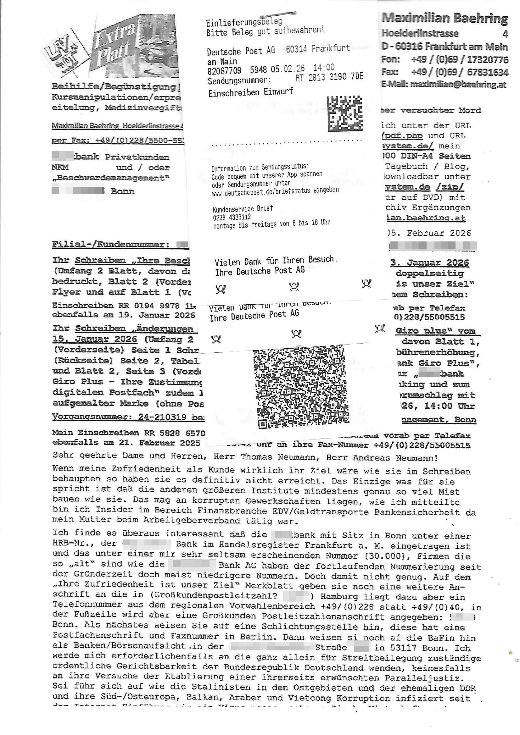 05.02.2026 11:00 Beihilfe/Begünstigung RAF–TERROR per Postunterschlagung Kursmanipulationen/erpresserischer Menschenraub/Strafver-eitelung, Medizinvergiftung/Vergewaltigung von Zeugen mehrfacher versuchter Mord Im Internet findet sich unter der URL http://banktunnel.eu/pdf.php und URL http://blog.sch-einesystem.de/ mein ausgedruckt über 35.000 DIN-A4 Seiten umfassendes Internet Tagebuch / Blog, ls Offline Version downloadbar unter http://*** /***/ als ISO-Image (brennbar auf DVD) mit tagesaktuellen ZIP-Archiv Ergänzungen http://tiktok.maximilian.baehring.at Maximilian Baehring Hoelderlinstrasse 4 D-60316 Frankfurt/M per Fax: +49/(0)228/5500-5515 ***bank Privatkunden NKM und / oder „Beschwerdemanagement“ D – 53245 Bonn Frankfurt a. M., den 05. Februar 2026 Filial-/Kundennummer: *** – Konto IBAN: *** Ihr Schreiben „Ihre Beschwerde vom 17.01.2026“ datiert auf 23. Januar 2026 (Umfang 2 Blatt, davon das erste nur vorderseitig, das zwote doppelseitig bedruckt, Blatt 2 (Vorder und Rückseite) „Ihre Zufriedenheit is unser Ziel“ Flyer und auf Blatt 1 (Vorderseite) Eingangsbestätung zu meinem Schreiben: Einschreiben RR 0194 9978 1DE vom 19. Januar 2026 außerdem noch vorab per Telefax ebenfalls am 19. Januar 2026 ca. 01:25 Uhr an ihre Fax-Nummer +49/(0)228/55005515 Ihr Schreiben „Änderungen und neue Entgelte für ihr ***bank Giro plus“ vom 15. Januar 2026 (Umfang 2 Blatt, beide doppelseitig bedruckt, davon Blatt 1, (Vorderseite) Seite 1 Schreiben mit Bitte um Zustimmung zu Gebührenerhöhung, (Rückseite) Seite 2, Tabelle „Leistungen und Preise für ***bank Giro Plus“, und Blatt 2, Seite 3 (Vorder-) und Seite 4 (Rückseite) Formular „***bank Giro Plus - Ihre Zustimmung zu neuen Entgelten, zum Online-Banking und zum digitalen Postfach“ zudem lag noch Rückumschlag bei, im Fensterumschlag mit aufgemalter Marke (ohne Poststempel) eingegangen 16. Januar 2026, 14:00 Uhr Vorgangsnummer: 24-210319 beim ***bank Privatkunden Beschwerdemanagement, Bonn Mein Einschreiben RR 5828 6570 2DE vom 21. Februar 2025 außerdem vorab per Telefax ebenfalls am 21. Februar 2025 ca. 06:42 Uhr an ihre Fax-Nummer +49/(0)228/55005515 Sehr geehrte Dame und Herren, Herr Thomas Neumann, Herr Andreas Neumann! Wenn meine Zufriedenheit als Kunde wirklich ihr Ziel wäre wie sie im Schreiben behaupten so haben sie es definitiv nicht erreicht. Das Einzige was für sie spricht ist daß die anderen größeren Institute mindestens genau so viel Mist bauen wie sie. Das mag an korrupten Gewerkschaften liegen, wie ich mitteilte bin ich Insider im Bereich Finanzbranche EDV/Geldtransporte Bankensicherheit da mein Mutter beim Arbeitgeberverband tätig war. Ich finde es überaus interessant daß die ***bank mit Sitz in Bonn unter einer HRB-Nr., der *** Bank im Handelsregister Frankfurt a. M. eingetragen ist und das unter einer mir sehr seltsam erscheinenden Nummer (30.000), Firmen die so „alt“ sind wie die *** Bank AG haben der fortlaufenden Nummerierung seit der Gründerzeit doch meist niedrigere Nummern. Doch damit nicht genug. Auf dem „Ihre Zufriedenheit ist unser Ziel“ Merkblatt geben sie noch eine weitere An-schrift an die in (Großkundenpostleitzahl? ***) Hamburg liegt dazu aber ein Telefonnummer aus dem regionalen Vorwahlenbereich +49/(0)228 statt +49/(0)40, in der Fußzeile wird aber eine Großkunden Postleitzahlenanschrift angegeben: *** Bonn. Als nächstes weisen Sie auf eine Schlichtungsstelle hin, diese hat eine Postfachanschrift und Faxnummer in Berlin. Dann weisen si noch af die BaFin hin als Banken/Börsenaufsicht in der *** Straße *** in 53117 Bonn. Ich werde mich erforderlichenfalls an die ganz allein für Streitbeilegung zuständige ordentliche Gerichtsbarkeit der Bundesrepublik Deutschland wenden, keinesfalls an ihre Versuche der Etablierung einer ihrerseits erwünschten Paralleljustiz. Sei führ sich auf wie die Stalinisten in den Ostgebieten und der ehemaligen DDR und ihre Süd-/Osteuropa, Balkan, Araber und Vietcong Korruption infiziert seit der Internet Einfühung wie ein Virus unser westeuropäische Wirtschaftssystem. [0] "202602051100-0-1.jpg" |