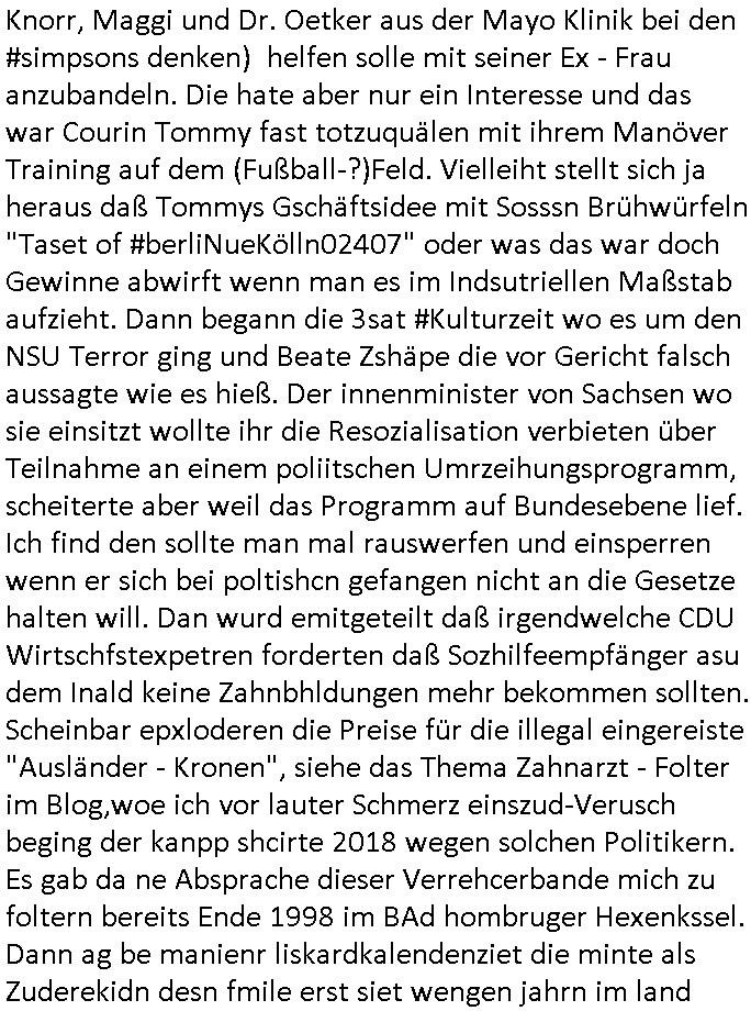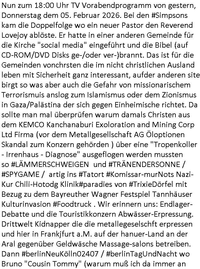 06.02.2026 06:00 Nun zum 18:00 Uhr TV Vorabendprogramm von gestern, Donnerstag dem 05. Februar 2026. Bei den #Simpsons kam die Doppelfolge wo ein neuer Pastor den Reverend Lovejoy ablöste. Er hatte in einer anderen Gemeinde für die Kirche "social media" eingeführt und die Bibel (auf CD-ROM/DVD Disks ge-/oder ver-)brannt. Das ist für die Gemeinden vonchrsten die im nicht christlichen Ausland leben mit Sicherheit ganz interessant, aufder anderen site birgt so was aber auch die Gefahr von missionarischem Terrorismuis anslog zum Islamismus oder dem Zionismus in Gaza/Palästina der sich gegen Einheimische richtet. Da sollte man mal überprüfen warum damals Christen aus dem KEMCO Kanchanaburi Exoloration and Mining Corp Ltd Firma (vor dem Metallgesellschaft AG Öloptionen Skandal zum Konzern gehörden ) über eine "Tropenkoller - Irrenhaus - Diagnose" ausgeflogen werden mussten so #LÄMMERSCHWEIGEN und #TRÄNENDERSONNE / #SPYGAME / artig ins #Tatort #Komissar-murNots Nazi-Kur Chili-Hotodg Klinik#paradies von #TrixieDörfel mit Bezug zu dem Bayreuther Wagner Festspiel Tannhäuser Kulturinvasion #Foodtruck . Wir erinnern uns: Endlager- Debatte und die Touristikkonzern Abwässer-Erpressung. Drittwelt Kidnapper die die metallegeselschft erpressen und hier in Frankjfurt a.M. auf der hanuer-Land an der Aral gegenüber Geldwäsche Massage-salons betreiben. Dann #berlinNeuKölln02407 / #berlinTagUndNacht wo Bruno "Cousin Tommy" (warum muß ich da immer an Knorr, Maggi und Dr. Oetker aus der Mayo Klinik bei den #simpsons denken) helfen solle mit seiner Ex - Frau anzubandeln. Die hate aber nur ein Interesse und das war Courin Tommy fast totzuquälen mit ihrem Manöver Training auf dem (Fußball-?)Feld. Vielleiht stellt sich ja heraus daß Tommys Gschäftsidee mit Sosssn Brühwürfeln "Taset of #berliNueKölln02407" oder was das war doch Gewinne abwirft wenn man es im Indsutriellen Maßstab aufzieht. Dann begann die 3sat #Kulturzeit wo es um den NSU Terror ging und Beate Zshäpe die vor Gericht falsch aussagte wie es hieß. Der innenminister von Sachsen wo sie einsitzt wollte ihr die Resozialisation verbieten über Teilnahme an einem poliitschen Umrzeihungsprogramm, scheiterte aber weil das Programm auf Bundesebene lief. Ich find den sollte man mal rauswerfen und einsperren wenn er sich bei poltishcn gefangen nicht an die Gesetze halten will. Dan wurd emitgeteilt daß irgendwelche CDU Wirtschfstexpetren forderten daß Sozhilfeempfänger asu dem Inald keine Zahnbhldungen mehr bekommen sollten. Scheinbar epxloderen die Preise für die illegal eingereiste "Ausländer - Kronen", siehe das Thema Zahnarzt - Folter im Blog,woe ich vor lauter Schmerz einszud-Verusch beging der kanpp shcirte 2018 wegen solchen Politikern. Es gab da ne Absprache dieser Verrehcerbande mich zu foltern bereits Ende 1998 im BAd hombruger Hexenkssel. Dann ag be manienr liskardkalendenziet die minte als Zuderekidn desn fmile erst siet wengen jahrn im land abrite und dahslab wniegr veörgen anghäft habe als die jegen die siet hderte vonJAhrn evrmögen anzuhäufen stünde es ihr aufgudn ihres usbjktevn ungerechtigkeits-epfidens zu den einheimischen in die tasch zu greifen udnre abre anmautzswender umzuevrteilen. Kann man solche Leute die ihre stabürgschft zu unrecht eschlichen nachträglch rückwirkend wieder ausbürgern? Dann bewrab man weig denfilm von greneinem "Squid Game" Asien-Kabel-PaylTV-star so ne art youtuber/tikoker. Er hatte einen Film gedreht "no other choice" wo es um Arbeitslose in Südkorea ging wo die "Samsung Galaxy" der Smarthones herkomt nicht ohne grund namens-identch mit einem FootballTeam hier aus Frankfurt a.M. . Die Geräte brauchen wie ein Plattenspieler Content, da sol en idnsure von leben der auch die Bundesregierung helfen will angebliche mit 250 Milolioen Födersumme wärhdndie Jprnlsite verügeltwrden damit selsberannet Tikot spaßvgl, Putin torlle wi trump imatatr Ryan Cheng sich austobe können mit ihnrem dmekortfdilchen Unfug . Bei den wiklchen dmekartetragenden Bloggern komtn nämlich keiner Födergeld an das vsckert alles in Kanälen der (auch 3sat) True-Crime Folter Pr0n Zuhältermafia. Dann ging es um ein "Vitamin Y" Ethno Jazz Musikerin. Dann gab es eine Ausstellung "Nature always wins" wo es siehe "CO2 Ruß der Titanic schlote bringt nen Eisberg zum schmelzen der das Schiff rammt" woebi ich mich frage wenn die Natur am Ende über die Menschheit obsiegt wozu dann der ganze Natur-Schutz? Dann zegte mein eine "Art Basel" Koshstch in Doha , Qatar deren Kurator von Selbstzensur sprach. Zum Abchluss dann ein frstämmger Raper [sic!] "weg hier raus" sang dieser. Dann wider #berlinNeuKölln02407 / #berliTagundNacht "Cousin Tommy" bricht bei "Trainings-" Manöver auf dem "Spiel-"Feld zusammen, wegen dem "Drill" es gibt dort aber keinerlei "Eisbad" wie bei Emmis Bier-Yoga. Er ist ja enttäuscht daß nchdem er sich "UNIFORMIERT" hat mit Brunos Ex Nora zusammen mit "Eltono" T-Shirts daß Brunos Tochtre Nora gar nichts mit den beiden zu tun haben will obehlc si encht weiß daß Bruno ihr leibelcher udn ehcter Vater ist den Tommy ersetzen will wobei er perverserwiese Brunos Hilfe einfordert. Der arbeitslos gewordene Mike ist frustriert. Er hat rausgfunden daß die Bar in der er arbriten anfangen wollte af ien eiladung hin deogen dealt und wahrschlich Gelwäsche betreibt. Wofür saß "Müllers kitchen" Bruno nochmal im Knast? Medizinvergoftung und Kidpping von "Rockstar?"-Groupie Nachwuchs der vrsucht die Plattenvertrag-Urheberrechte an Filemn zu vrhörn unter Verwis auf einen lelblichen Vater der sich angclhen wiegret Utrehat z u zhalen was wohl daarn liegt daß er von seinem Kind nichst wusste. Suprrichen Kinder anvergewaltige unter Drogen gesetzt, das psst prima zur Stakhosue/ Hexen-kessel Bad Homburg gang die mit Mile Rakta am "Snackpoint-Charlie / After Eight" versuchte mir Koks unerzuschieben, die shcon damsl im Shcülerztusgbüro versicht hatten solcche Redakteure mit Marihuana zu kopromittren der El