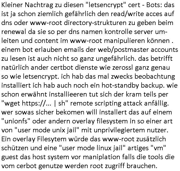 06.02.2026 10:00 Kleiner Nachtrag zu diesen "letsencrypt" cert - Bots: das ist ja schon ziemlich gefährlich den read/write acces auf dns oder www-root directory-strukturen zu geben beim renewal da sie so per dns namen kontrolle server um-leiten und content im www-root manipulieren können . einem bot erlauben emails der web/postmaster accounts zu lesen ist auch nicht so ganz ungefährlich. das betrifft natürlich ander certbot dienste wie zerossl ganz genau so wie letsencrypt. ich hab das mal zwecks beobachtung installiert ich hab auch noch ein hot-standby backup. wie schon erwähnt installieeren tut sich der kram teils per "wget https://... | sh" remote scripting attack anfällig. wer sowas sicher bekomen will installert das auf einem "unionfs" oder andern overlay filesystem in so einer art von "user mode unix jail" mit unprivilegiertem nutzer. Ein overlay Filesytem würde das www-root zusätzlich schützen und eine "user mode linux jail" artiges "vm" guest das host system vor maniplation falls die tools die vom cerbot genutze werden root zugriff brauchen. https://faq.tickets.tu-dresden.de/otrs/public.pl?Action=PublicFAQZoom;ItemID=1274 verzeichnis anlegen #chown `useradd`? [0] "202602061000-0-1.jpg" [1] "202602061000-0-2.jpg" |