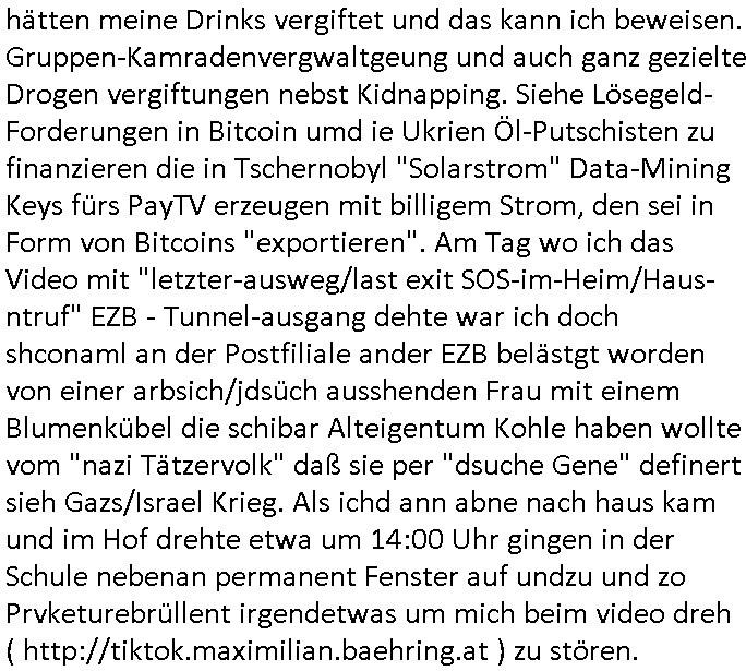 06.02.2026 15:45 Nachdem ich gestern ja Ärger hatte mit der Bitcoin-Mafia (die haben mir ja mehrfach Email geschickt daß sie Löse-gelder für mein entführtes Kind haben wollen die ich an die Ermittlusgbehörden weitgelietet habe und Komplizen hier im Hause sitzen, Erdgeschoss, Südseite, zum Hof hin) wurde ich eben massivst beschimpft von so einer Junkie Niggerin die ich von dem Suizdverch den ich unfreiwillge-rise unetrenomen habe von der Psychiatrie her kenne. Das ist eine ohne ordentlichen Aufenthasstatus nehme ich an oder mit US-Amry Backrund die im Rahmen von anrtisrssmus "#PSEUDONONYMISIERUNG" behete alle tan denen dsuchtsämmge weiße Fraue und Männer zum Opfer gefallen wärn wärn rassistche Gewalt gegen Niger gewesen, dabi ging es bei Rassismusvorwurf um das Erb-merkmal "demenz" bei dsuchen altehimbewhnerinen dei von Artsuderen aus demObslcok um Ihr Alteigetum Erbe betrogen wurden. Den hate man bgspschen daß sie Opfer von Straftaren wern könnten weils sie "Alzheimer" / "Nazi" Gene hätten (Gene-chatteilgung = Rassismus): Opfer müssten aber wgen Hitler imer weiblich sein und südländischen Mihigru haben. Sie sörte zshcne 13:49 udn 13:50 Uhr vor demrbsichenkosulat miendrehaberten und brüllte das was man ihr udnireh Stammbsürden angtan habe sie asu Rache nun den Deutschen antun wolle. Die ist gefährlich und sie schien mir voll auf Droge zu sein. Sie sgte man habe irh essnvegfite, ich sagte armee ver-gewaltger (gegen die ich aussagte, aus Rache Gründen ) hätten meine Drinks vergiftet und das kann ich beweisen. Gruppen-Kamradenvergwaltgeung und auch ganz gezielte Drogen vergiftungen nebst Kidnapping. Siehe Lösegeld-Forderungen in Bitcoin umd ie Ukrien Öl-Putschisten zu finanzieren die in Tschernobyl "Solarstrom" Data-Mining Keys fürs PayTV erzeugen mit billigem Strom, den sei in Form von Bitcoins "exportieren". Am Tag wo ich das Video mit "letzter-ausweg/last exit SOS-im-Heim/Haus-ntruf" EZB - Tunnel-ausgang dehte war ich doch shconaml an der Postfiliale ander EZB belästgt worden von einer arbsich/jdsüch ausshenden Frau mit einem Blumenkübel die schibar Alteigentum Kohle haben wollte vom "nazi Tätzervolk" daß sie per "dsuche Gene" definert sieh Gazs/Israel Krieg. Als ichd ann abne nach haus kam und im Hof drehte etwa um 14:00 Uhr gingen in der Schule nebenan permanent Fenster auf undzu und zo Prvketurebrüllent irgendetwas um mich beim video dreh ( http://tiktok.maximilian.baehring.at ) zu stören. [0] "202602061545-0-1.jpg" [1] "202602061545-0-2.jpg" |